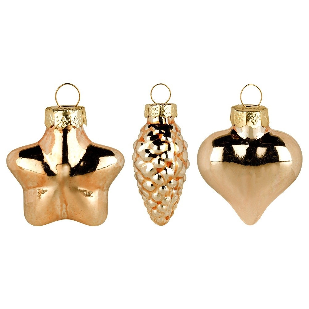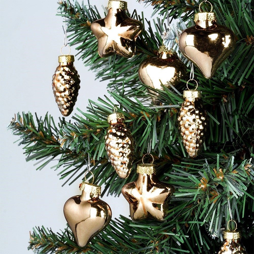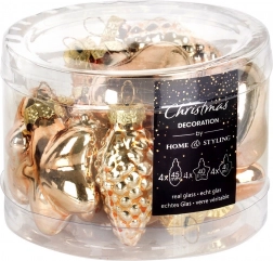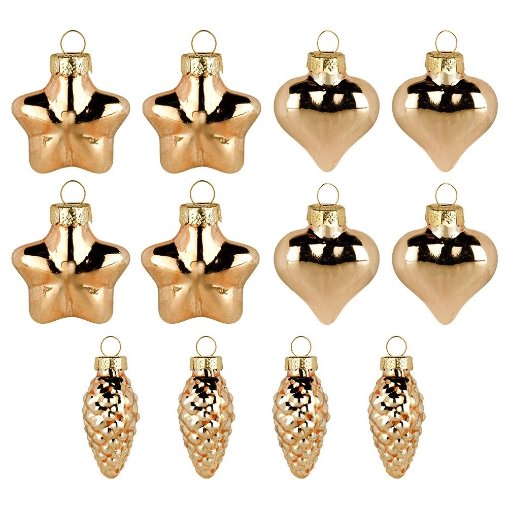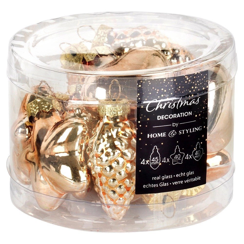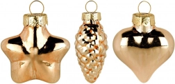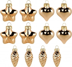 Elegant sæt med 12 glasjuleornamenter i en luksuriøs gylden farve, der får hvert træ og enhver festlig dekoration til at stråle. Kombinationen af hjerter, stjerner og kogler i størrelsen 4–4,5 cm skaber et harmonisk og stilfuldt helhedsudtryk. Ornamenterne er af ægte glas, har en skinnende, stærkt reflekterende overflade og kan takket være øsknerne let hænges på grene, guirlander og kranse.