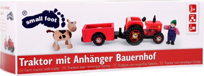Oplev landlivets charme med Small Foots trætraktor med træk, som leveres med en landmand og en ko. Takket være de bevægelige figurer og gummibelagte hjul for støjsvag kørsel får børn en sikker og stille legeoplevelse. Den aftagelige trailer understøtter kreative lege og stimulerer fantasi, sprog og sociale færdigheder.
