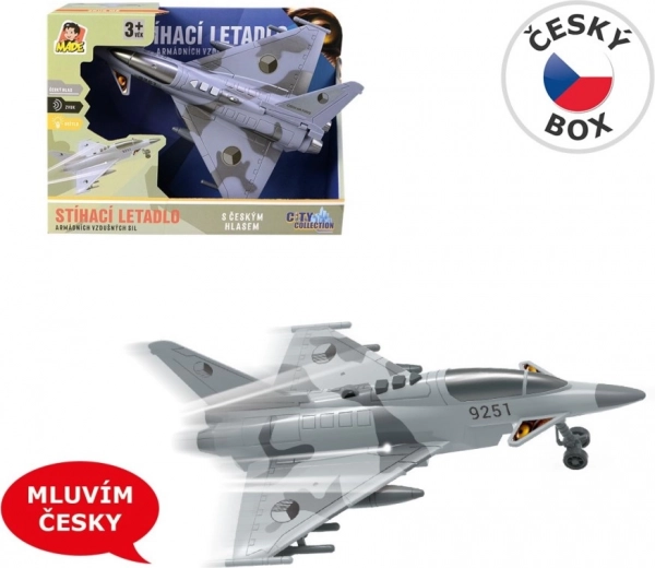 Nyd actionfyldte luftmissioner med et detaljeret jagerfly prydet med nationalitetsmærker fra Tjekkiet. Modellen tilbyder autentiske dialoger på tjekkisk mellem kontroltårn og pilot, lysende effekter og lyd af et flyvende jagerfly, som forstærker stemningen i legen.