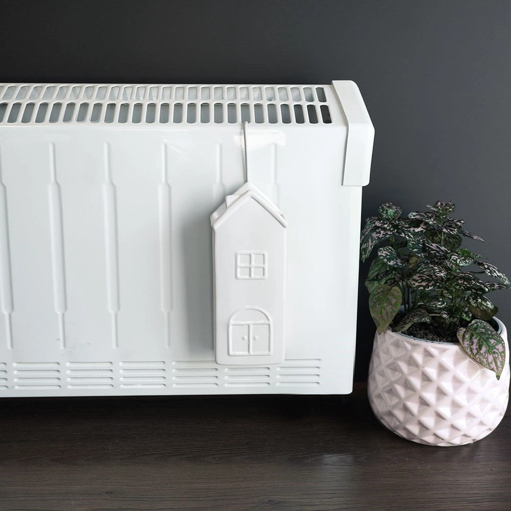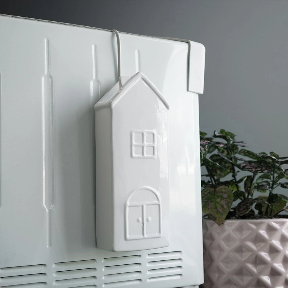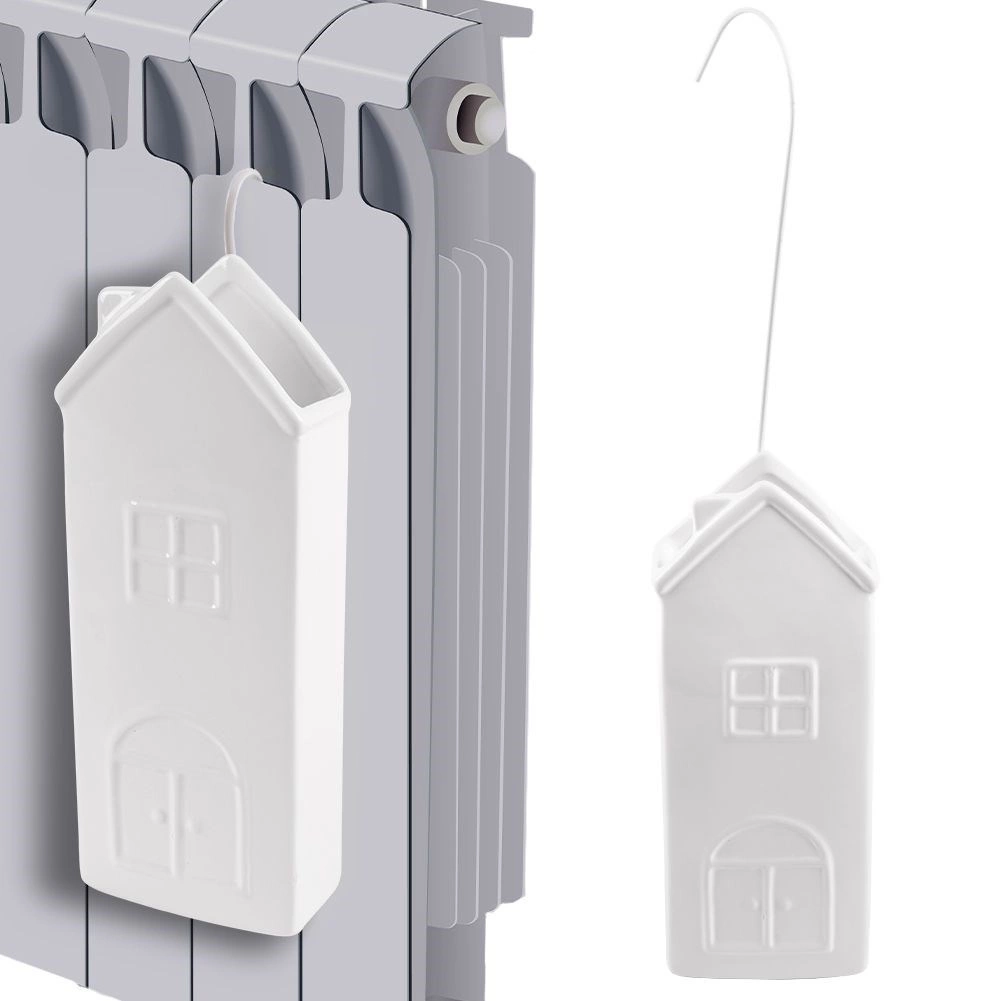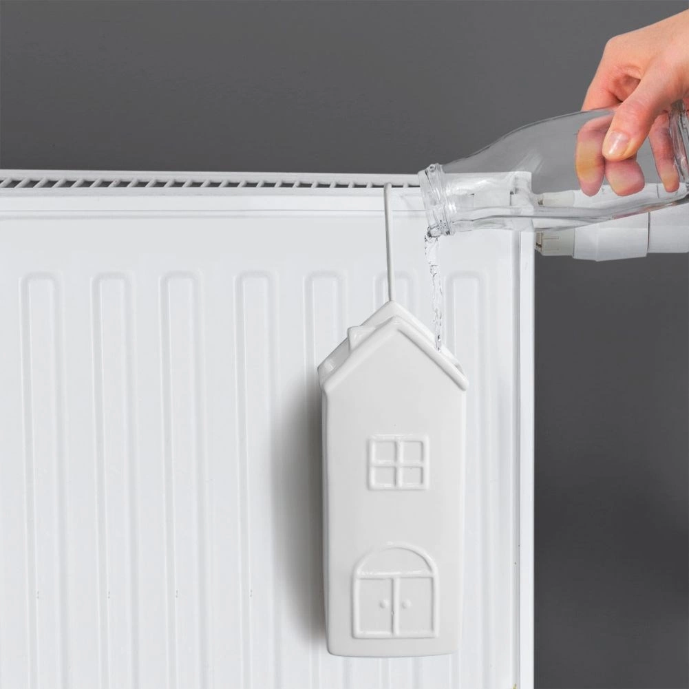 Elegant keramisk luftfugter til radiator i husform med en kapacitet på 300 ml hjælper med at opretholde optimal luftfugtighed i fyringssæsonen. Takket være nem ophængning på metalkrog og let anvendelse er det nok blot at fylde vand på. Den hvide glasur og det dekorative design passer ind i enhver indretning. Kvalitetskeramik sikrer lang levetid og sikker drift.