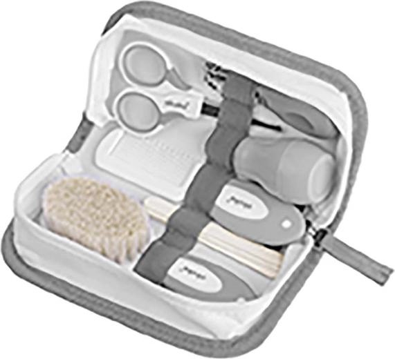 - Saks med afrundede spidser, negleklipper, neglefil, børste med naturlige børster, kam med skridsikkert håndtag, næseaspirator med blød spids