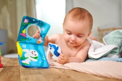 Denne lette og flydende badebog glæder børn med klare farver og enkle illustrationer, som styrker formgenkendelse og ordforråd. Det bløde materiale er behageligt at røre ved, let at rengøre og sikkert for de første tænder.