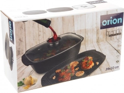 Pakkens indhold: 1× dyb rektangulær bradepande (ydre 39 × 22 × 10 cm; indre 32 × 21 × 9,5 cm; 5 l), 1× grillpande/låg (ydre 39 × 22 × 5 cm; indre 31 × 20 × 4 cm; 2 l), 1× glaslåg (ydre 34 × 22,5 × 6,5 cm). ORION – originalt produkt fremstillet efter europæiske standarder.
