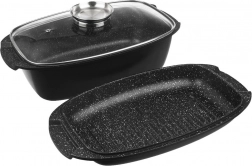 Praktisk granitsæt til daglig madlavning: dyb bradepande 5 l, grillpande der også fungerer som låg, og varmebestandigt glaslåg med doser. Robust støbt aluminium med dobbelt PFLUON GRANIT-belægning akkumulerer varme effektivt og sikrer jævn tilberedning med minimalt olieforbrug.