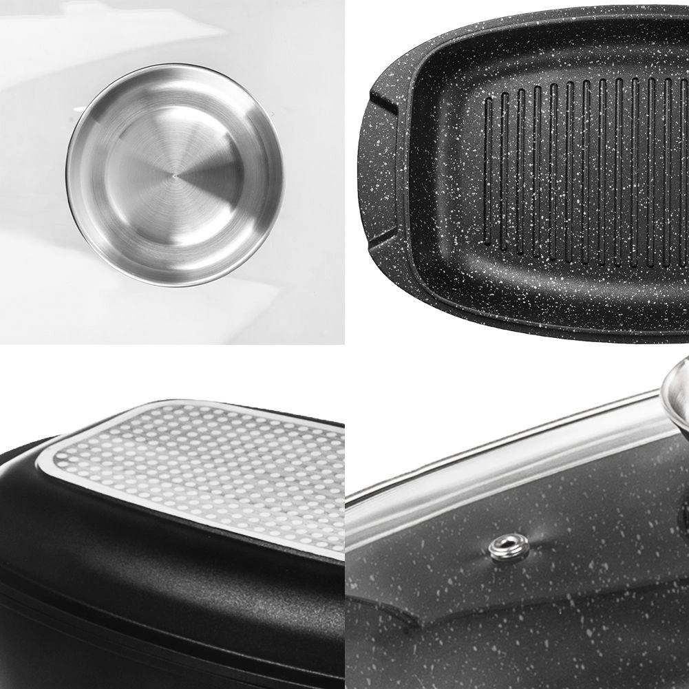 Maksimal alsidighed i ét sæt. Grillpanden kan bruges separat eller som låg til bradepanden – sparer plads og tid ved madlavning og bagning.