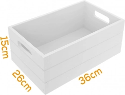 En praktisk hvid trækasse til opbevaring, der hjælper dig med at holde orden i hjemmet og på kontoret. Den måler 36 × 26 × 15 cm, er lavet af solidt træ og er let at bære takket være sidehåndtagene. Perfekt til kosmetik, kontorartikler, garderabetilbehør eller køkkenredskaber. Den er alsidig, holdbar, multifunktionel og samtidig dekorativ.