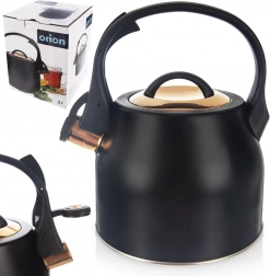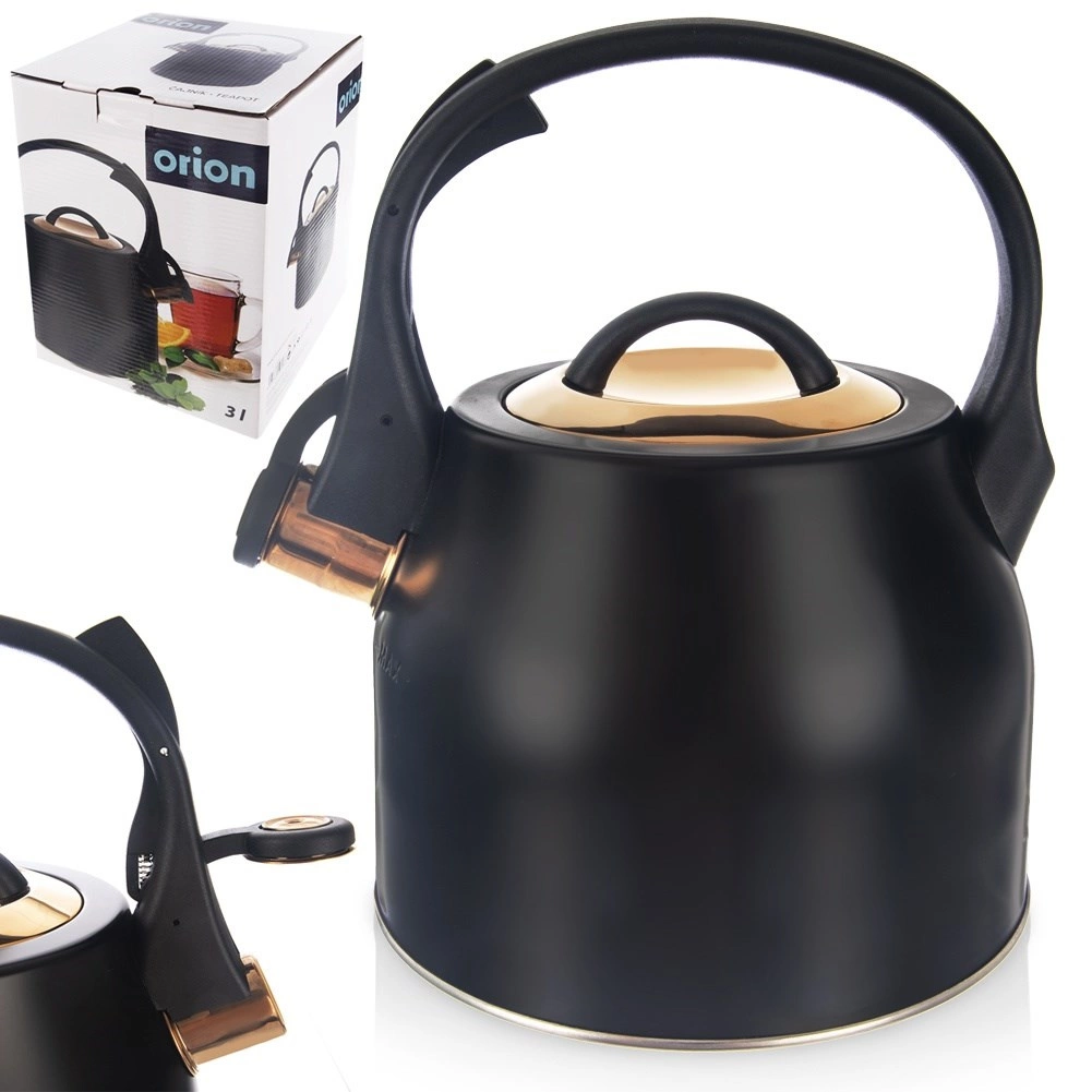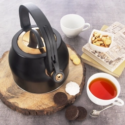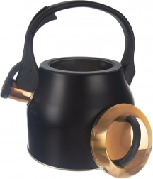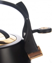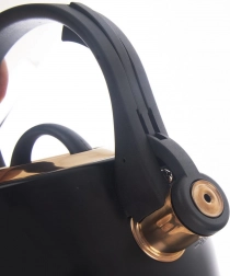 En stilfuld kedel i rustfrit stål i kombinationen sort og guld bliver et smukt indslag i både moderne og klassiske køkkener. Takket være den brede, stabile bund og det kvalitetsmateriale varmer den vandet hurtigt og energibesparende uden at påvirke smagen. Den opklappelige fløjte giver pålidelig signalering ved kogepunktet, mens det behagelige, varmebestandige håndtag sikrer et sikkert greb.
