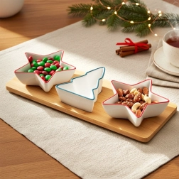 Elegant serveringssæt med bakke indeholder tre porcelænsskåle – to formet som stjerner og én som et træ – samt et rektangulært bambusfad. Ideelt til nødder, oliven, dips og forretter under festlige sammenkomster. Kvalitetsporcelæn i hvid og en stabil bambusbakke med udfræsninger for bedre fastgørelse af skålene. Skålene kan tåle opvaskemaskine (uden bakken).