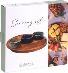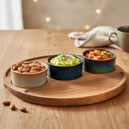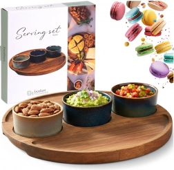 Stilfuldt 4-delt serveringssæt med træbakke og tre keramiske skåle – ideelt til oliven, nødder, dips og antipasti. Hver skål har en unik glasur, og akacietræsbakken har fræsede fordybninger for stabilitet. Mål for sættet 25 × 25 × 4,5 cm, skåle 7 × 3 cm, volumen 65 ml. Skålene er egnet til opvaskemaskine (uden bakken).