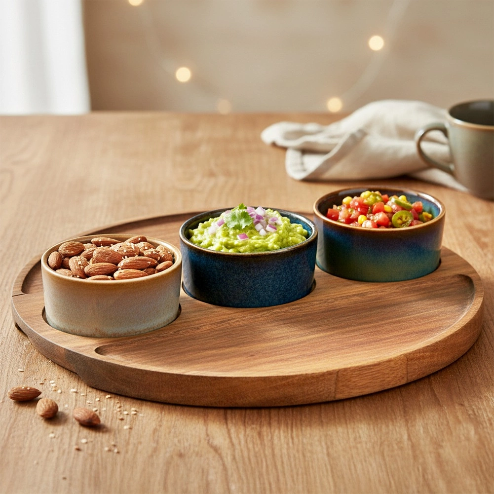 Gør hvert møde til et særligt øjeblik. Dette elegante serveringssæt kombinerer kvalitetsstentøj med reaktiv glasur og en solid akacietræsbakke med præcise udskæringer, der holder skålene sikkert på plads. Perfekt til både hverdagsbrug og festbordet og fungerer også glimrende som en stilfuld gave.