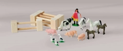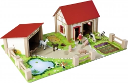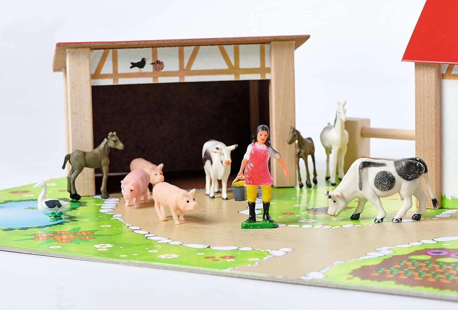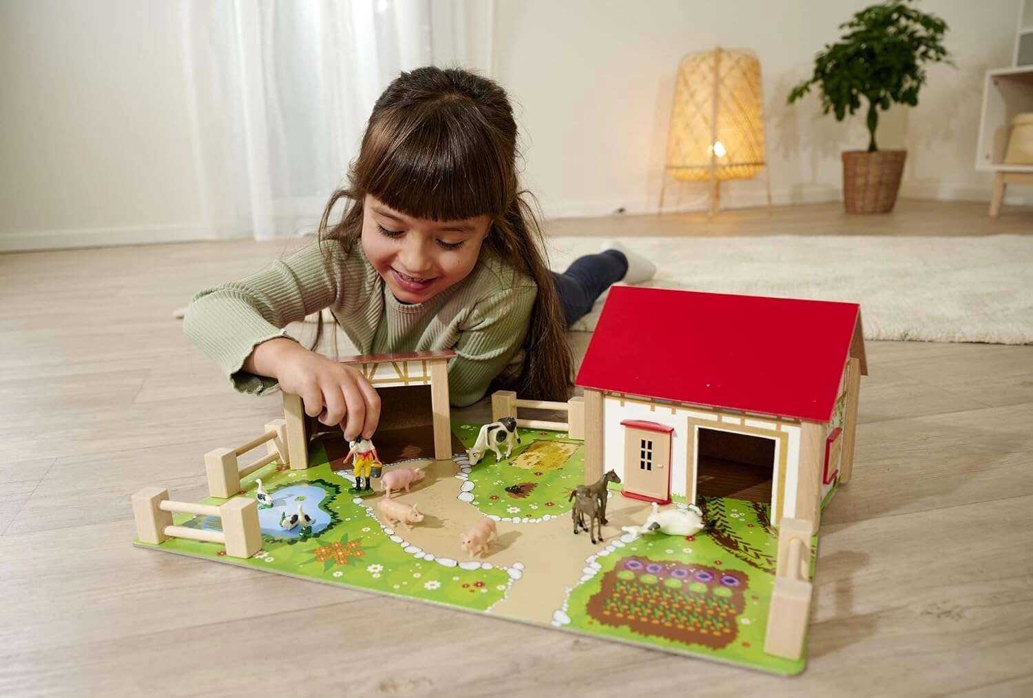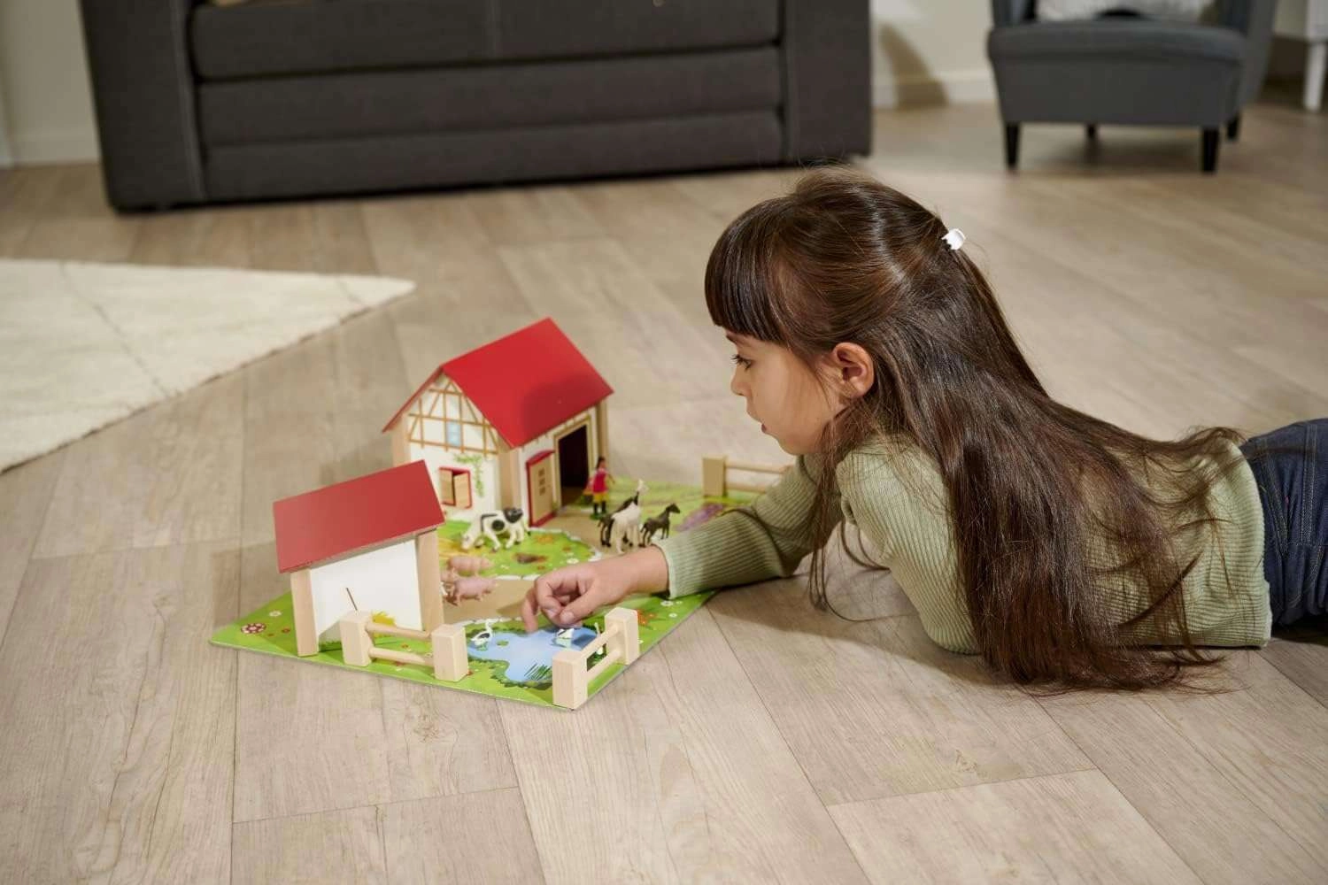 Sættet indeholder et stort hus med indhegning og stald, farverig base 51 × 36 cm, hegn samt 12 figurer af dyr og en landmand. Legetøjet understøtter koordination, læring af farver og former samt kendskab til husdyr.