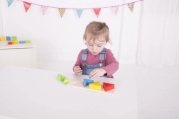 Enkle former og klare farver (rød, blå, grøn, gul) støtter den visuelle perception og logisk sortering. At lægge brikkerne i de tilsvarende pladser styrker korrekt matchning.