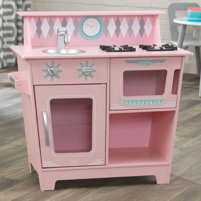 KidKraft Børnekøkken tilbyder mange funktioner, der udvider børns fantasi. Det er udstyret med en vask, multifunktionel komfur og mikrobølgeovn. Detaljerede kogeplader og drejeknapper, der laver kliklyde, bidrager til en realistisk legeoplevelse.