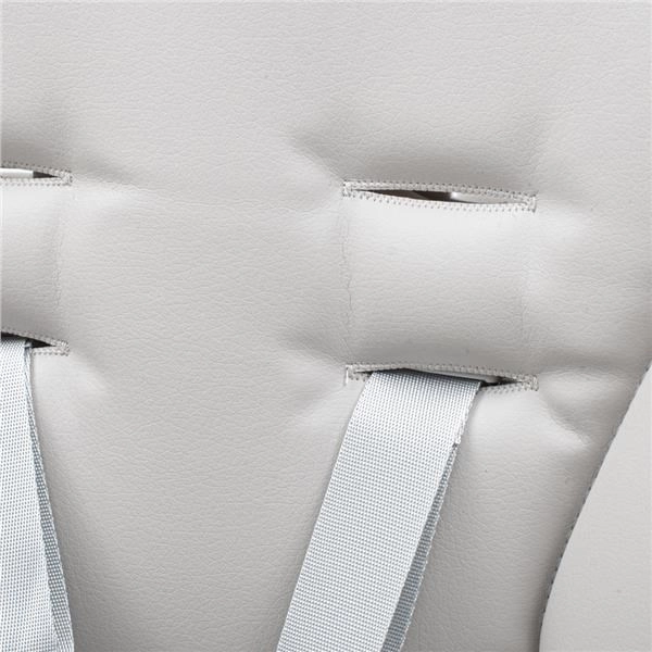 Sikkerheden sikres af 5-punktsseler og en stabil konstruktion. Det dobbelte aftagelige bakke-bord gør servering og rengøring nemt, mens det brede, formede sæde og den bløde polstring giver komfort under både måltider og hvile.