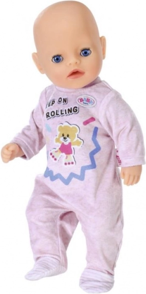 Lad din dukke slappe af med stil. Denne bløde BABY BORN Little heldragt 36 cm i en sart lyserød farve har et legende “Keep on rolling”-print med en bamse og integrerede strømper, så dukken aldrig fryser om fødderne. Takket være det løsere snit kan selv små børn nemt tage den på og af.