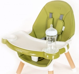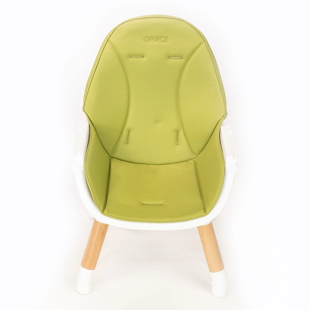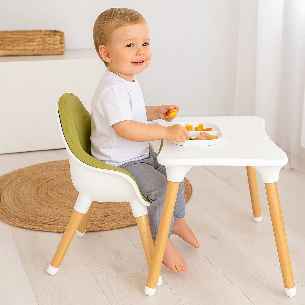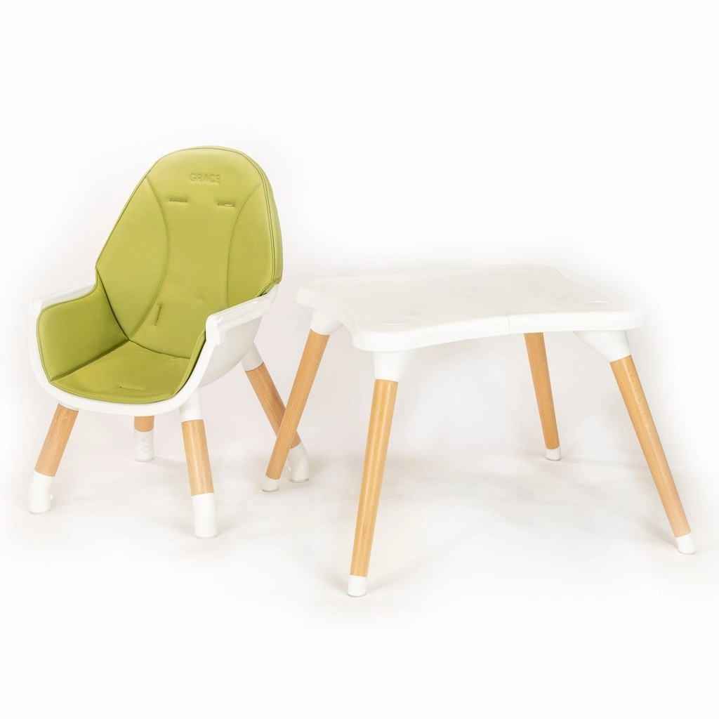 Den moderne børnehøjstol 3-i-1 NEW BABY Grace i elegant grøn kombinerer høj stol, lav stol og sæt med bord + stol. Den tilbyder stabil konstruktion, 5-punkts sikkerhedsseler med bløde beskyttere, let aftørreligt polster i økolæder og aftagelig bakke med holdere til flaske eller kop. Ideel fra de første skemåltider til kreativ leg og tegning.