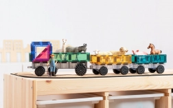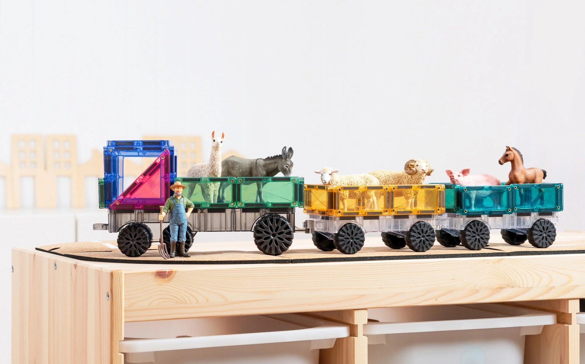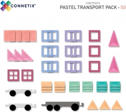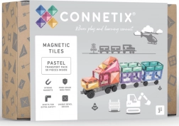 CONNETIX Pastel Transport Pack indeholder 50 holdbare, gennemsigtige dele med stærke neodymmagneter og tre chassiser med hjul. Børn kan nemt bygge biler, tog eller futuristiske maskiner, mens de naturligt stifter bekendtskab med 2D/3D-geometri, symmetri og fysiske principper (balance, stabilitet, årsag–virkning). Delene forbinder sikkert fra alle sider, og “klikket” ved samling motiverer til flere forsøg.