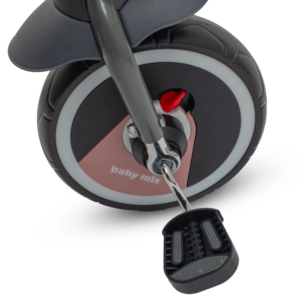 Den robuste stålramme og hjul af hærdet EVA-skum giver stabilitet, fremragende greb og kræver ingen oppumpning. Friløbsfunktion, fodbremser på baghjulene og forreste skærm øger komfort og kontrol. Takket være den sammenklappelige konstruktion kan trehjuleren let lægges i bilens bagagerum.
