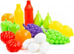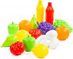 Sættet indeholder druer, æbler, citrusfrugter, tomater og flere dele, som stimulerer fantasien og lærer børn at skelne mellem fødevarer og farver.