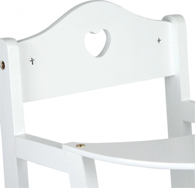 Denne træhøjstol til dukker i ren hvid er et stilfuldt supplement til både børneværelse og stue. Den diskrete hjerteudskæring i ryglænet giver et sødt udtryk, mens den robuste konstruktion sikrer sikker og langvarig underholdning.