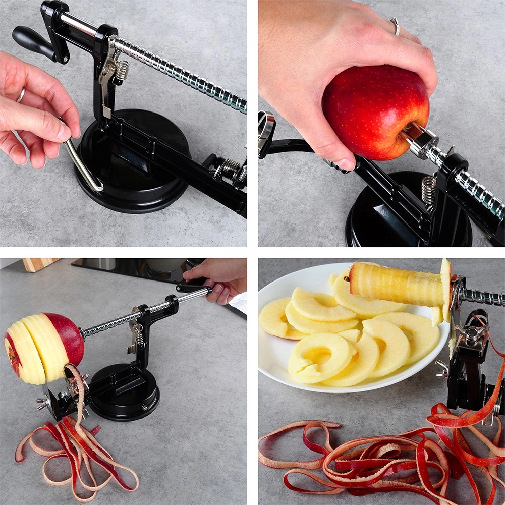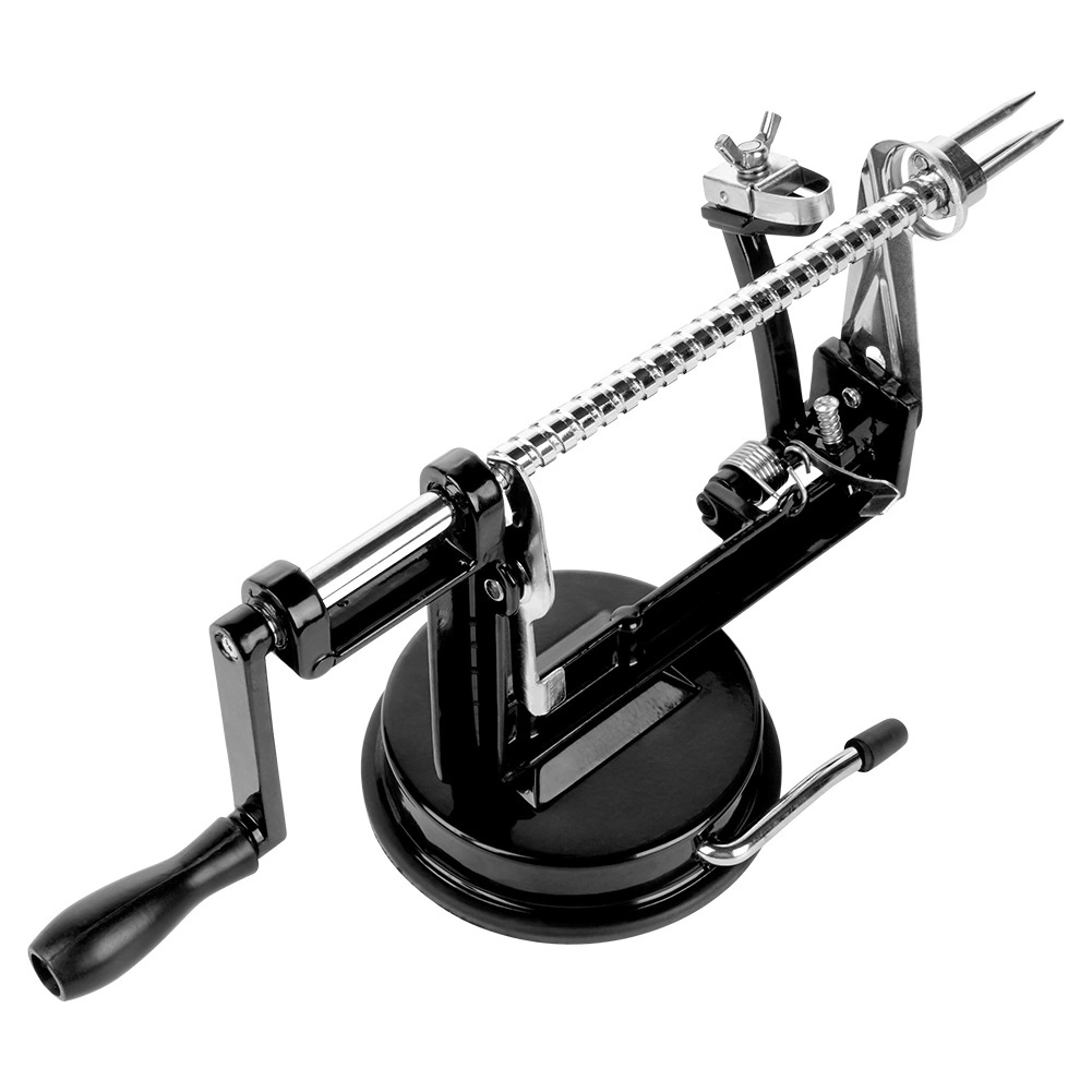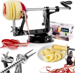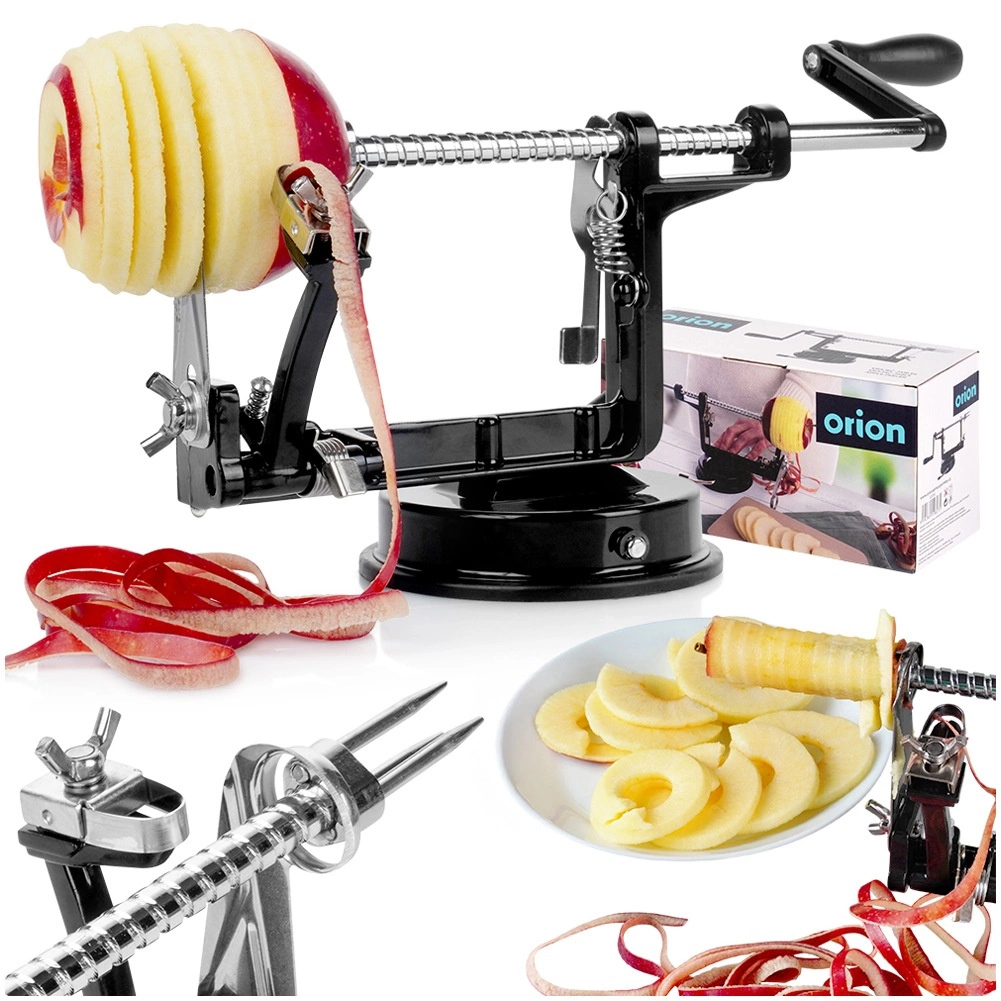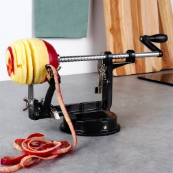 En praktisk køkkenhjælper, som i én arbejdsgang skræller, udstikker kernehuset og skærer æbler, pærer eller kartofler i dekorative spiraler. Takket være præcis føring og skarpe knive får du regelmæssige skiver ideelle til strudler, sprøde chips, tørring eller dekorativ servering.
