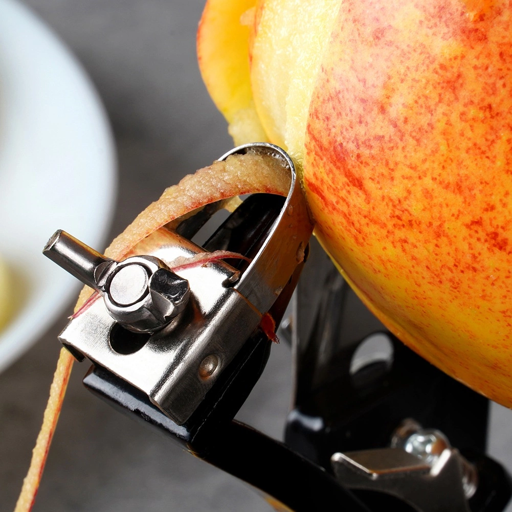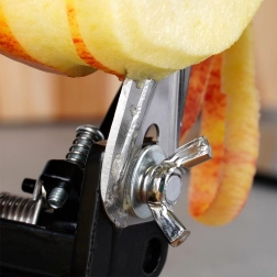 Med én glidende drejning af håndtaget skræller du, fjerner kernehuset og skærer regelmæssige ringe med en tykkelse på cirka 3 mm. Perfekt til desserter, chips og tørring.