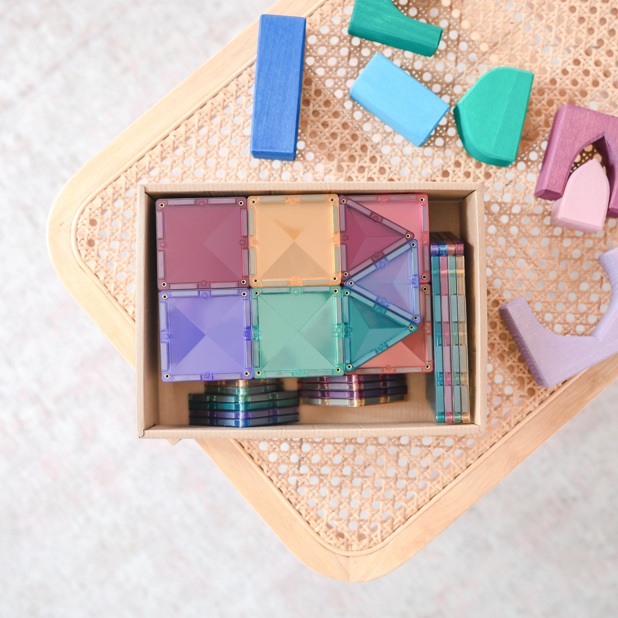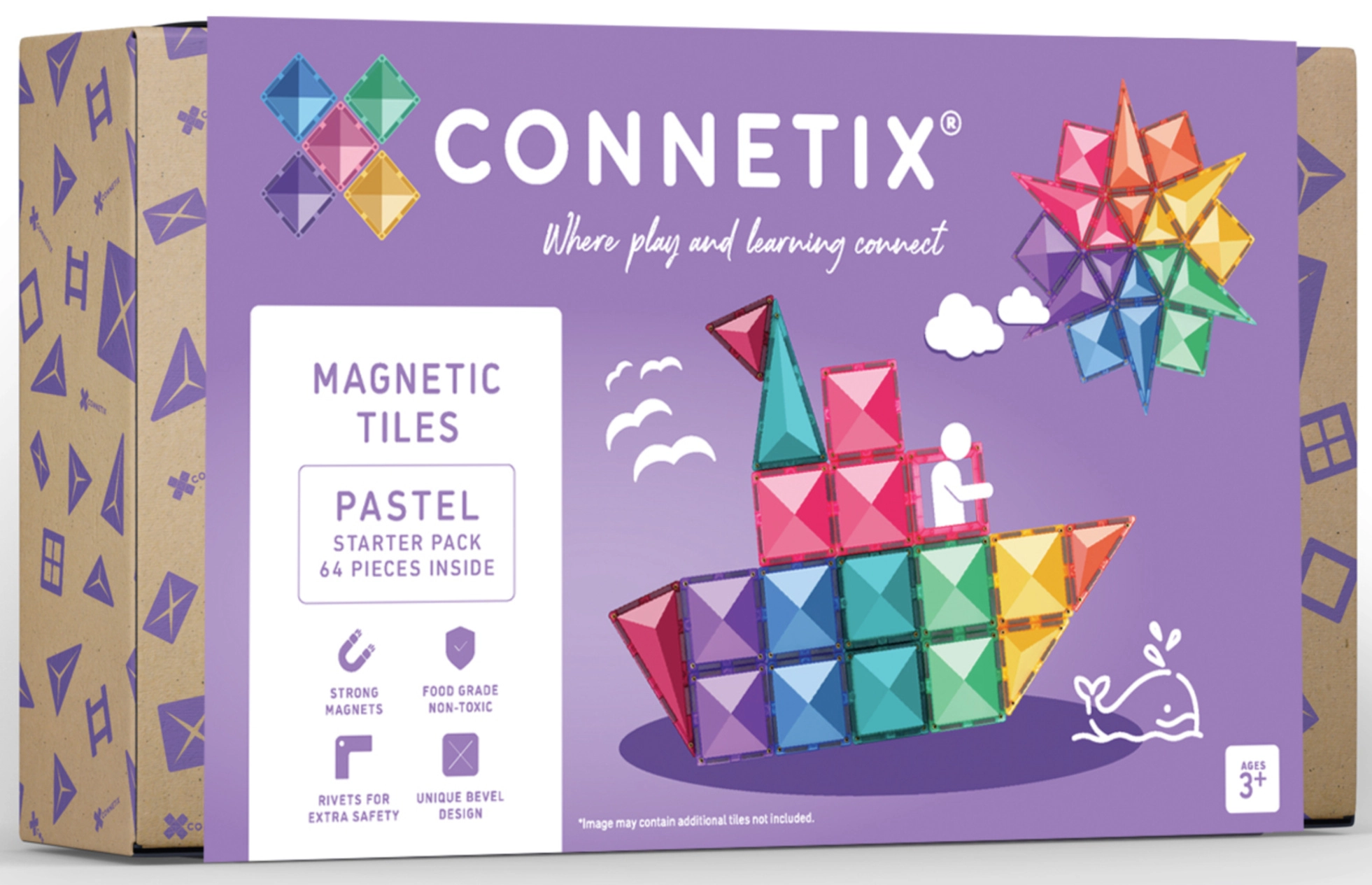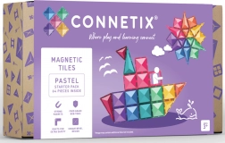 CONNETIX Pastel Starter Pack bringer 64 transparente fliser i blide farver, som børn kan bruge til at bygge tårne, slotte, broer og raketter. Takket være magneter langs kanterne forbindes delene fra alle sider, konstruktionerne er stabile, og den behagelige “klik”-lyd motiverer til videre udforskning. Sættet er fantastisk til at udvikle STEAM-færdigheder – fra magnetisme og balance til symmetri og 2D/3D-geometri.