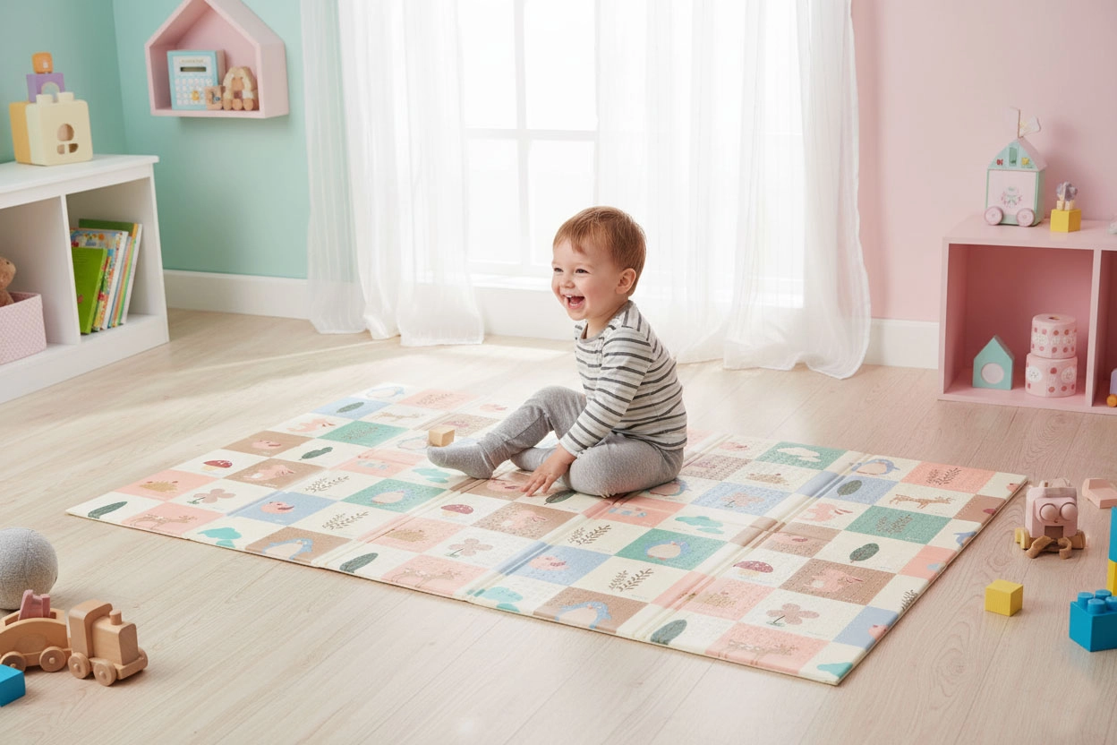 XPE-skum med en tykkelse på 1 cm giver effektiv dæmpning ved fald og isolerer samtidig mod kolde gulve – ideel til kravlen, de første skridt og længere lege.