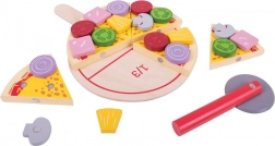 Seks pizzastykker med velcrosamlinger holder sammen og kan “skæres” med den medfølgende træskærer. Børn kan prøve realistisk skæring og servering.