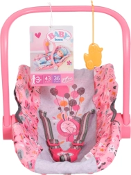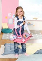 Denne stilfulde rosa autostol og bæresele til BABY born-dukker er designet til børn fra 3 år. Takket være det solide plastkorpus, den bløde betrækning og sikkerhedsremmen giver den dukken komfort og støtte under transport og hvile. Det drejelige håndtag gør det nemt at skifte fra bære- til sidde- eller vuggemode.