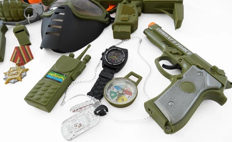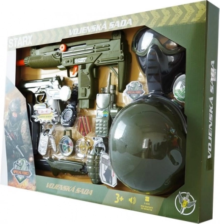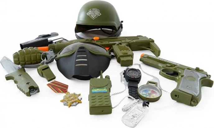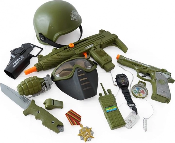 Sæt til den lille soldat med hjelm, pistol og andet tilbehør.