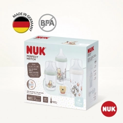 Startsæt med sutteflasker NUK Perfect Match med DISNEY Peter Plys-motiv tilbyder en blød og smidig sut, som tilpasser sig naturligt barnets læber og gane. Takket være antikolikfunktionen, temperaturindikatoren og de forskellige flaskestørrelser er drikningen for barnet jævn, komfortabel og sikker.