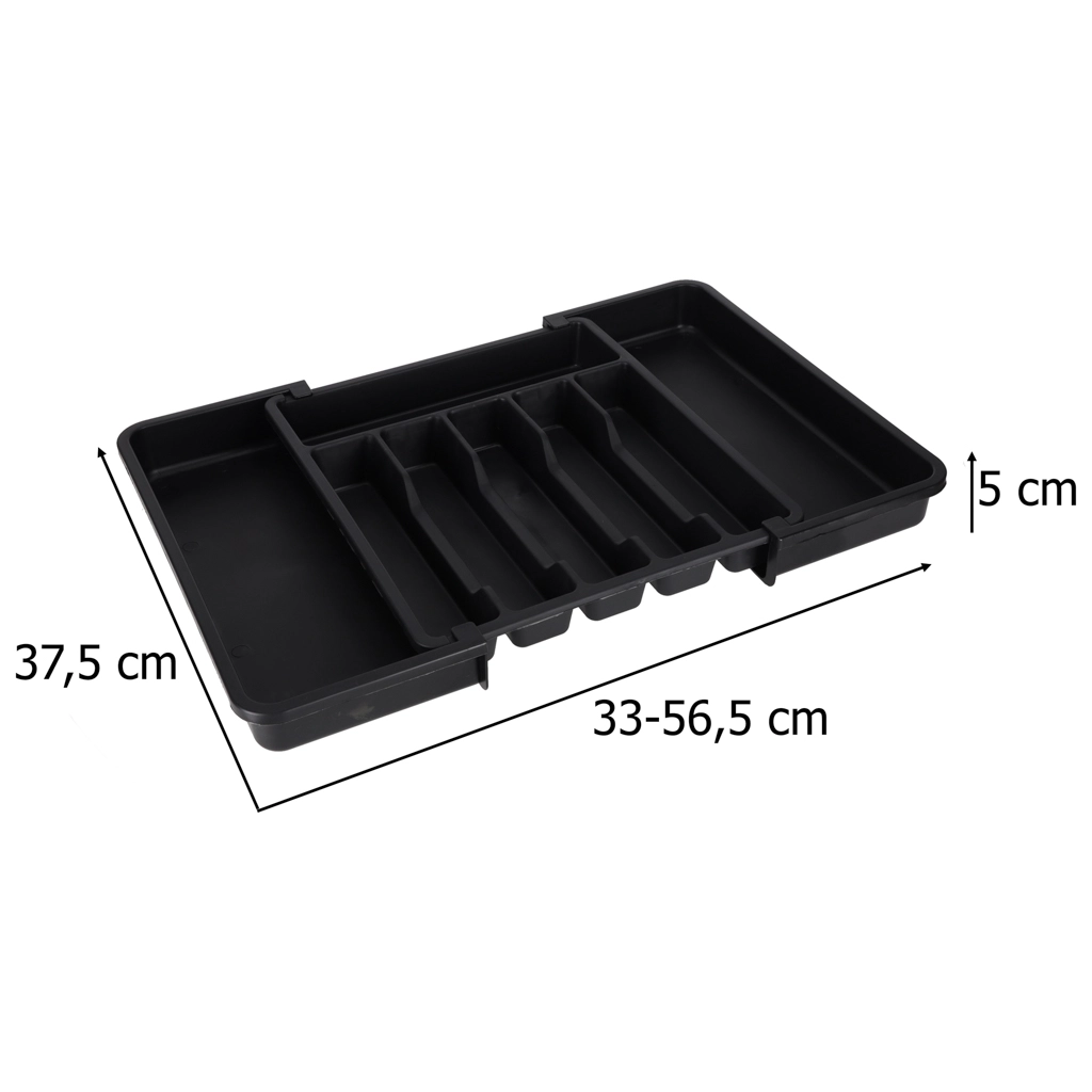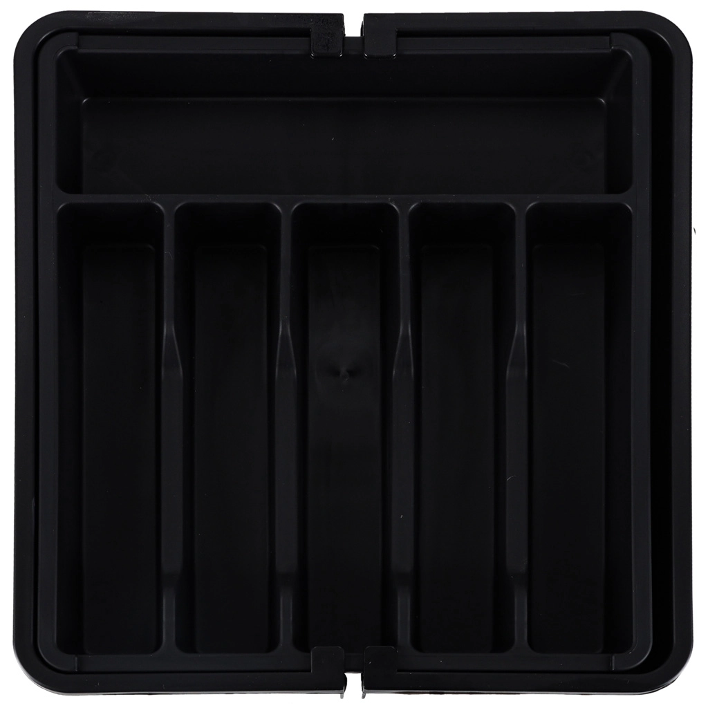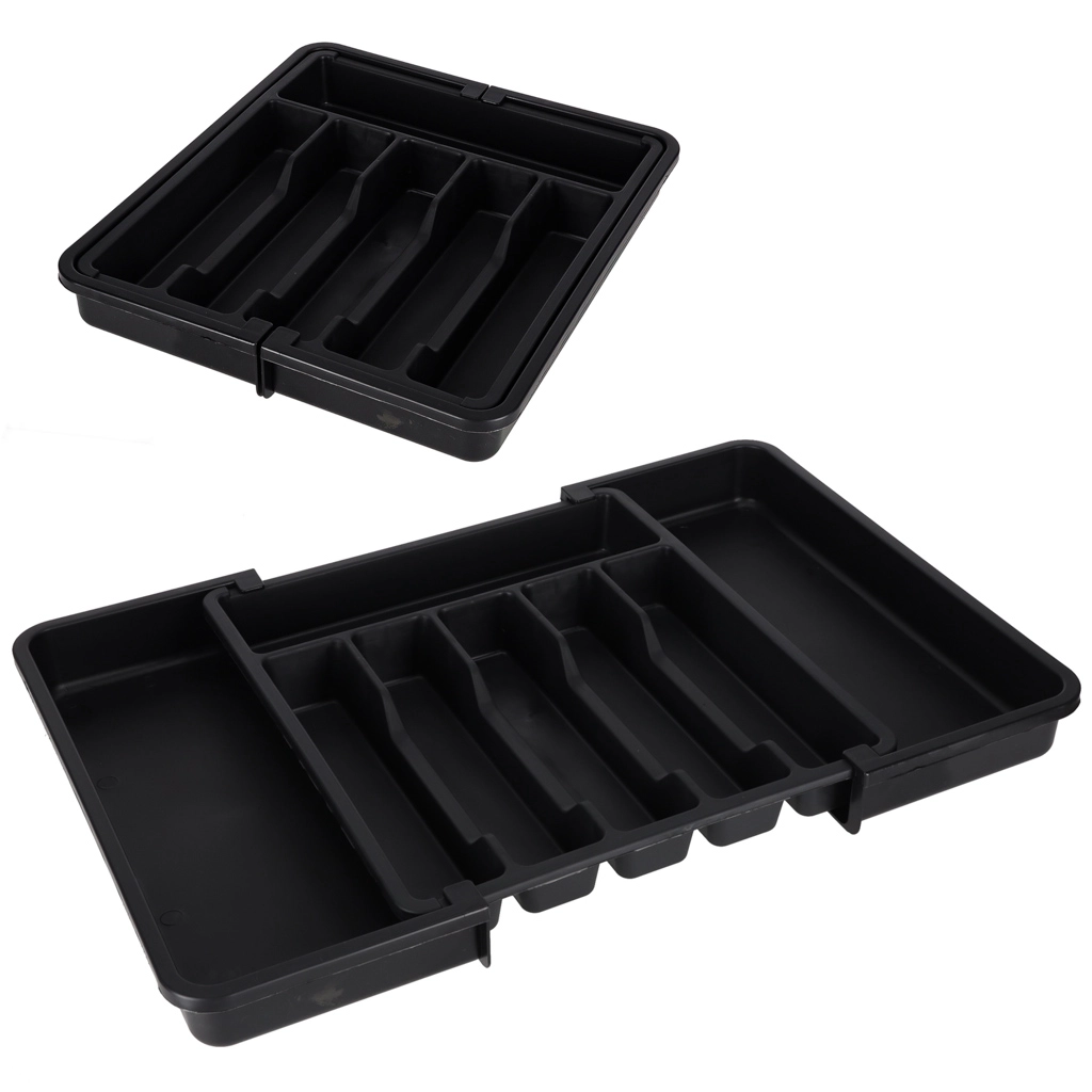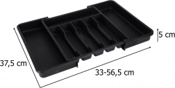 Den moderne, modulære indsats til køkkenskuffer hjælper dig med at udnytte pladsen maksimalt. Den udtrækkelige konstruktion gør det muligt at indstille bredden præcist, så organiseren passer perfekt i både smalle og brede skuffer. Det elegante sorte design og de glatte overflader er lette at vedligeholde og giver køkkenet et ensartet udtryk.