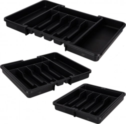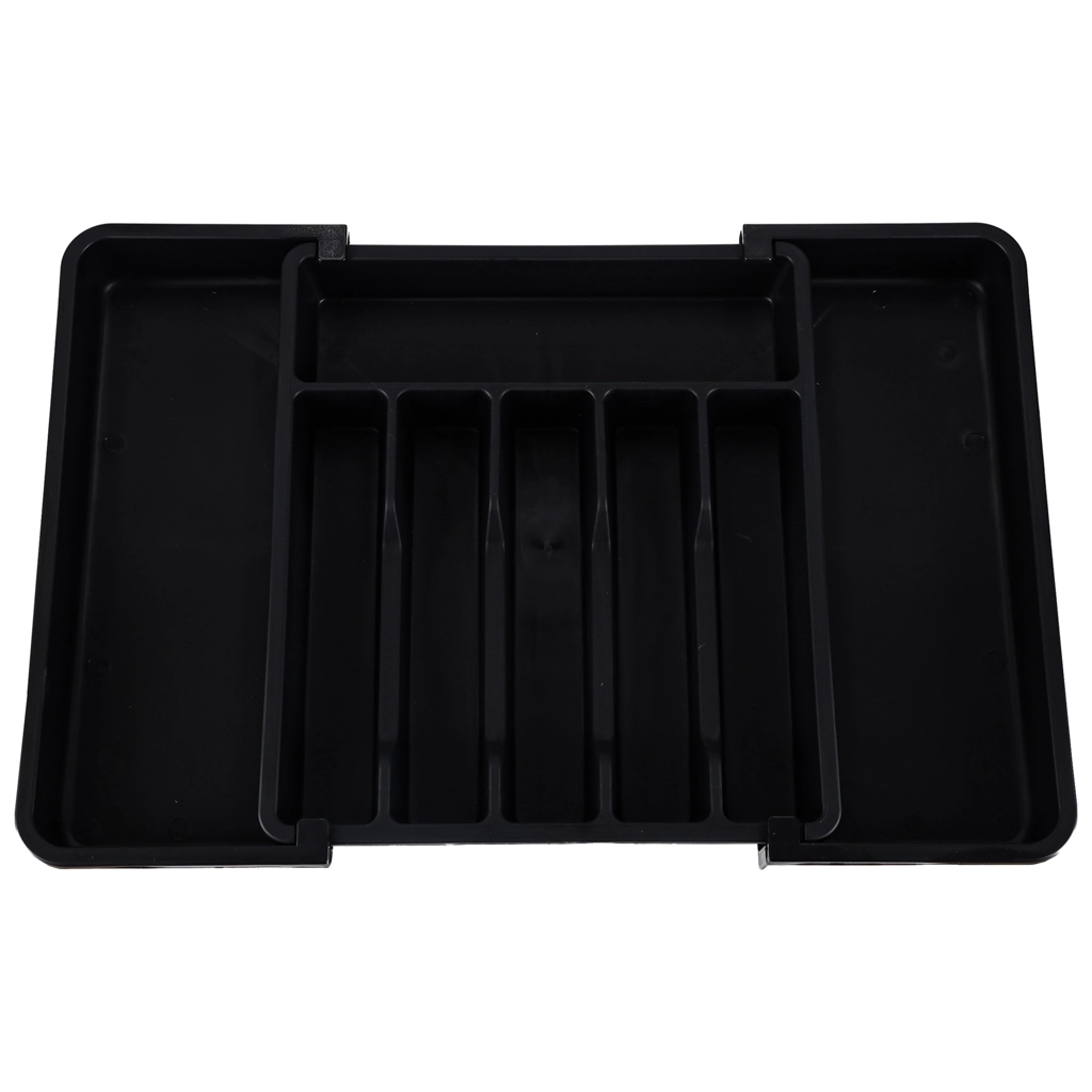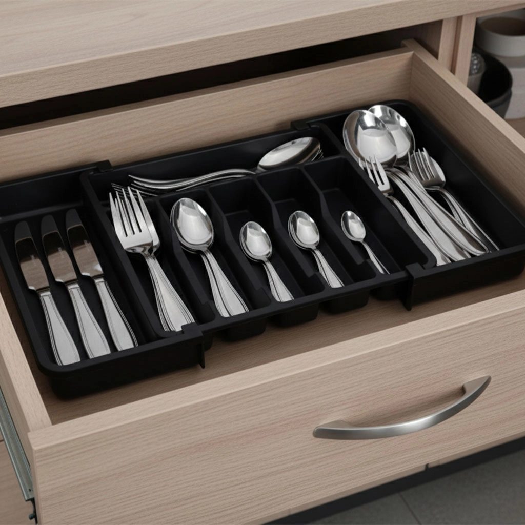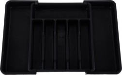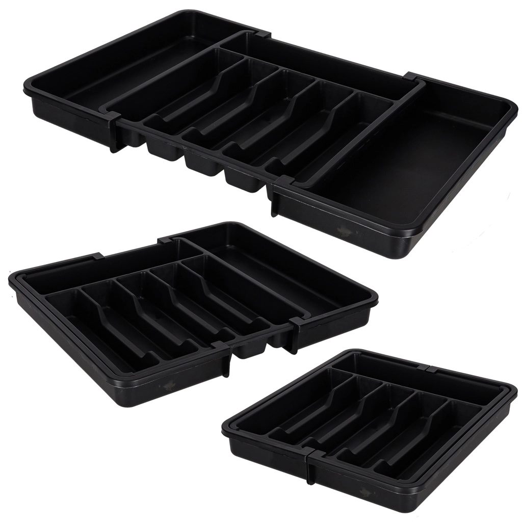 Den moderne, modulære indsats til køkkenskuffer hjælper dig med at udnytte pladsen maksimalt. Den udtrækkelige konstruktion gør det muligt at indstille bredden præcist, så organiseren passer perfekt i både smalle og brede skuffer. Det elegante sorte design og de glatte overflader er lette at vedligeholde og giver køkkenet et ensartet udtryk.