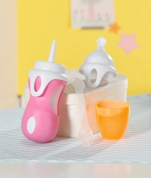 Den interaktive flaske og ske til BABY Born dukker er det perfekte tilbehør til realistisk leg. Dette sæt inkluderer en flaske med to vedhæftninger – én til drikke med lydeffekt og en anden med ske til fodring af grød. Det er blot at trykke grøden ud gennem åbningen i bunden og flasken er klar til brug.