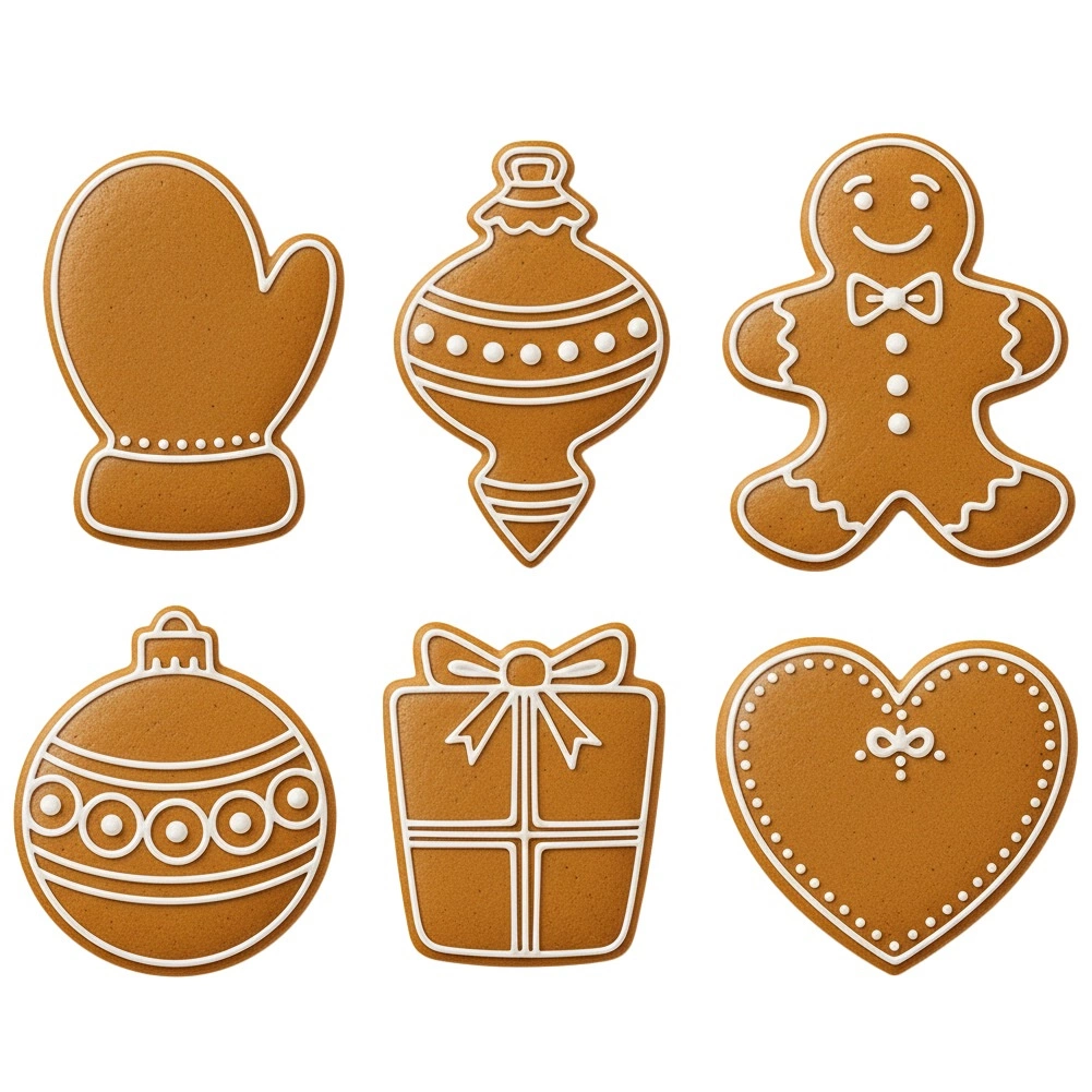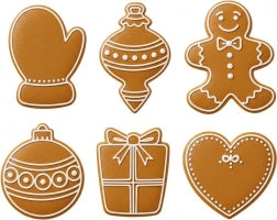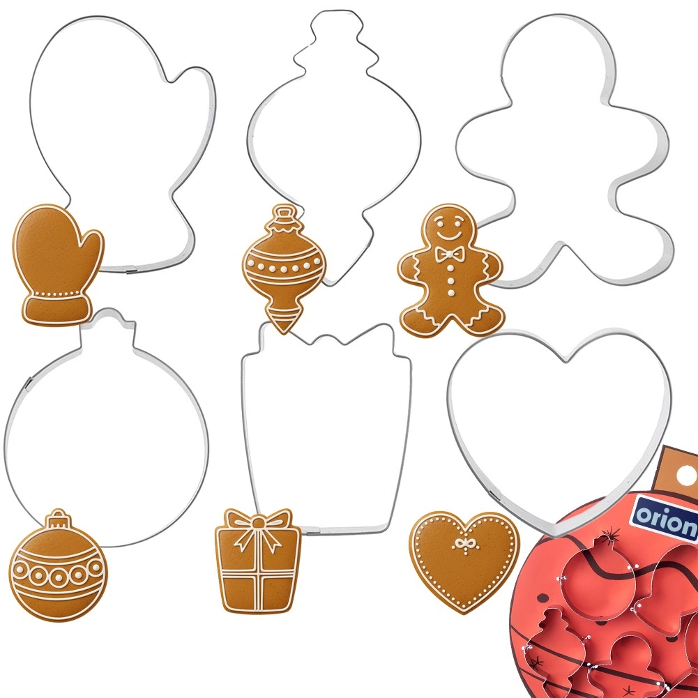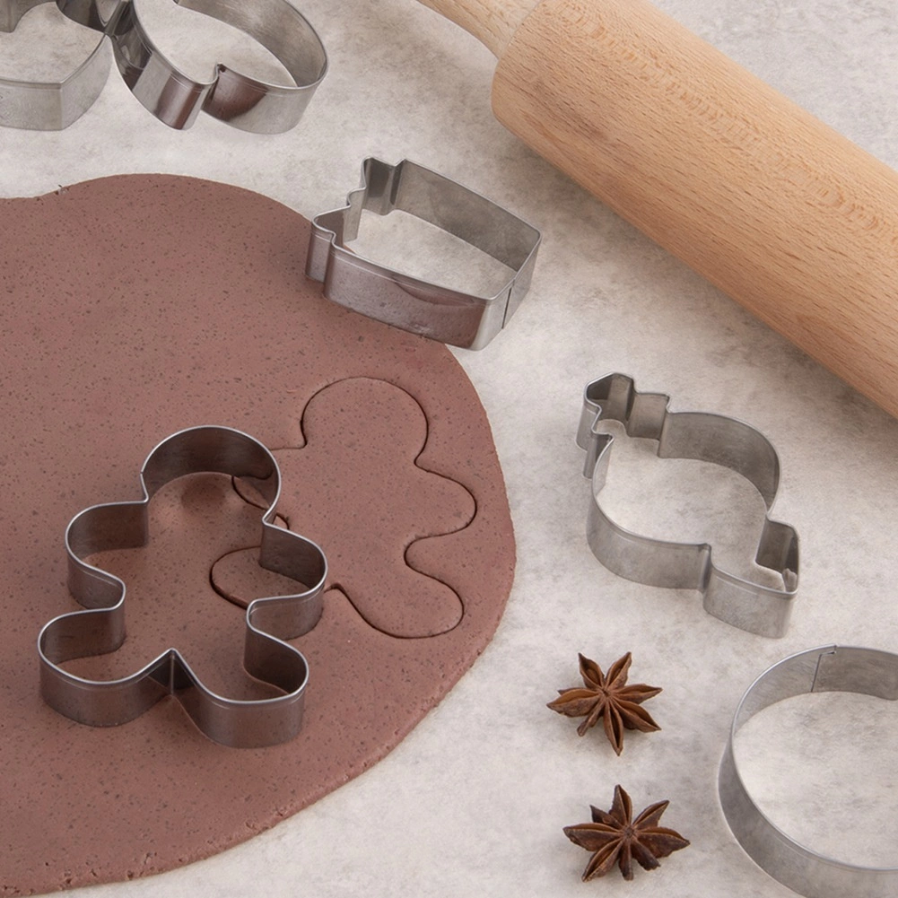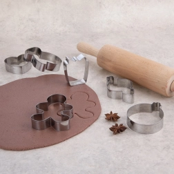 Dette sæt indeholder seks populære motiver – vante, aflang pynt, honningkagefigur, rund kugle, gave og hjerte. Udstikkerne i kvalitets rustfrit stål er solide, holdbare og skærer præcise linjer uden at trevle dejen. Takket være de glatte skærekanter udstikker du nemt ensartede former til småkager, der ser perfekte ud.