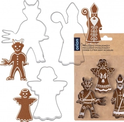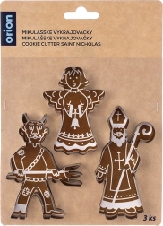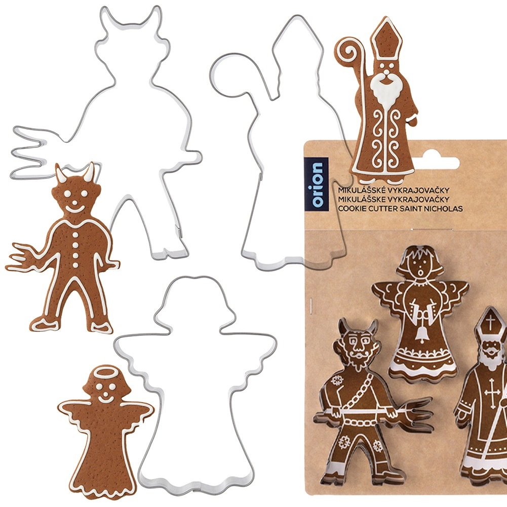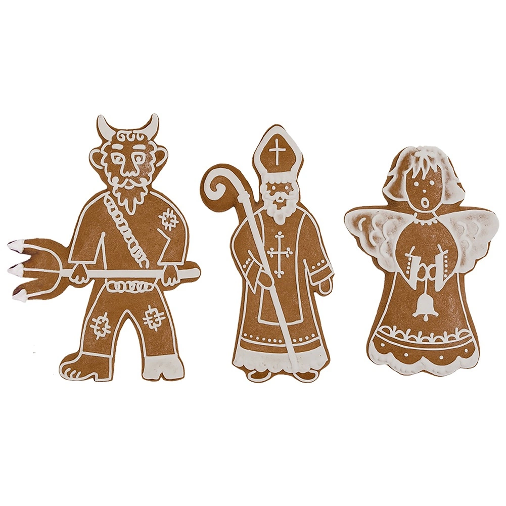 Mål på formene: engel 8 × 6 × 1,5 cm, djævel 9,5 × 7 × 1,5 cm, Skt. Nikolaus 10 × 5 × 1,5 cm. Materialet er hygiejnisk, holdbart og langtidssikrende, så sættet kan bruges i mange sæsoner.