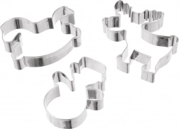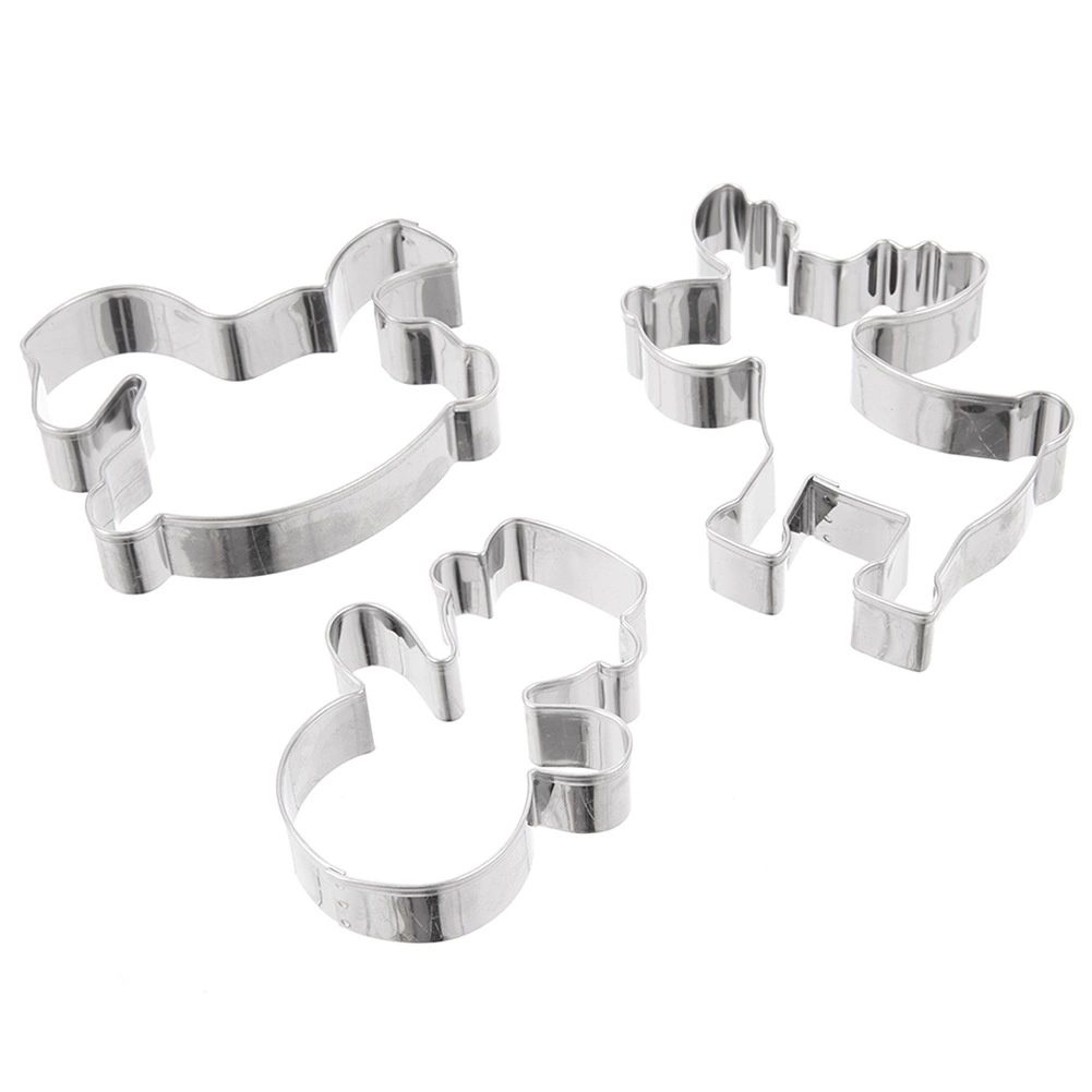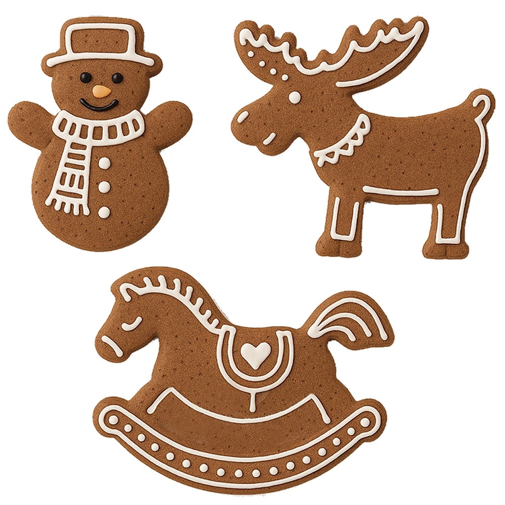 Praktisk sæt med tre udstiksforme i rustfrit stål i form af en snemand, en gyngende hest og et rensdyr til nem bagning af julekager og honningkager. Takket være den solide konstruktion i kvalitetsrustfrit stål er formene robuste, lette at rengøre og tåler opvaskemaskine. Skab smukke former til småkager, honningkager og fondantpynt, og nyd julebagningen med præcise udskæringer, alsidig anvendelse og lang holdbarhed.