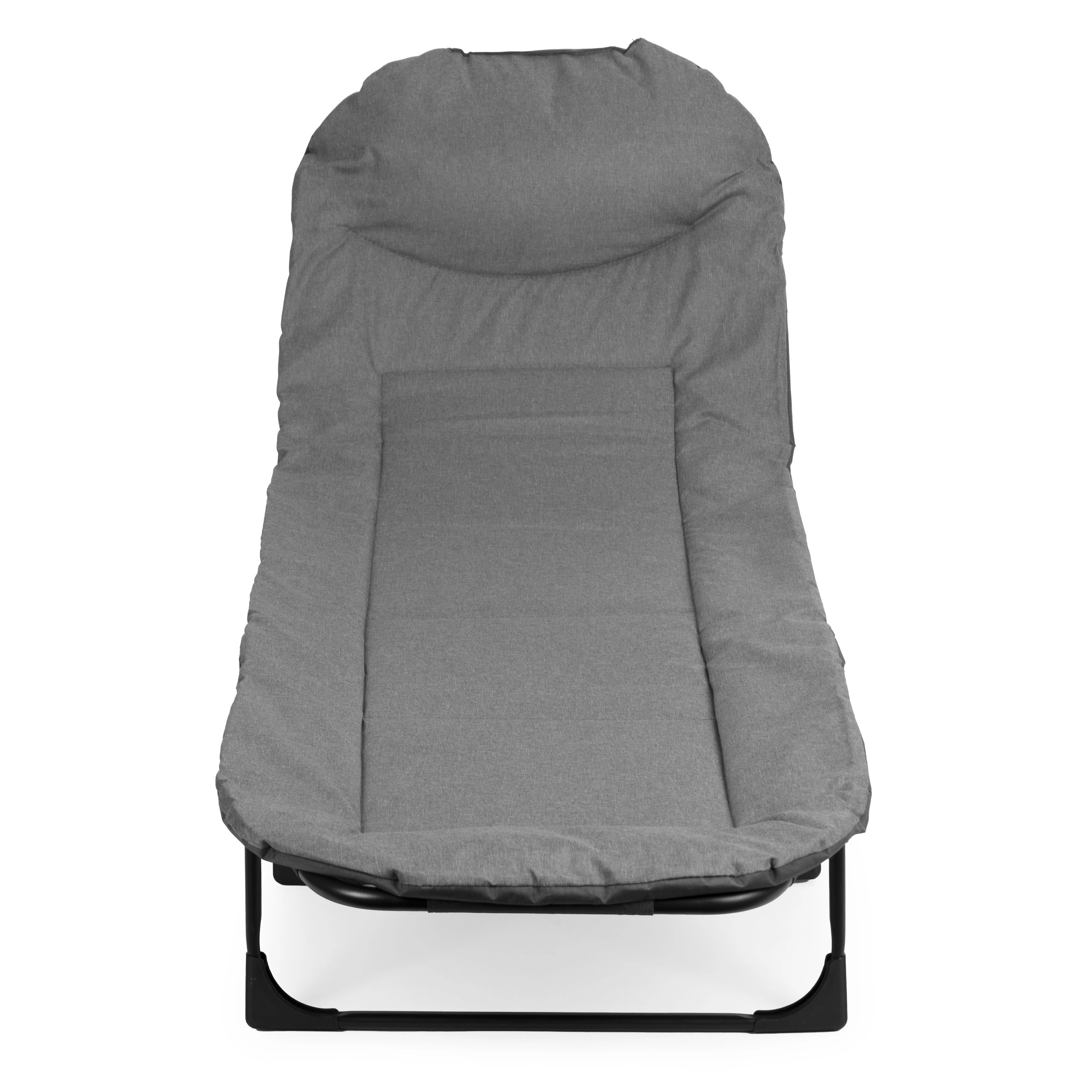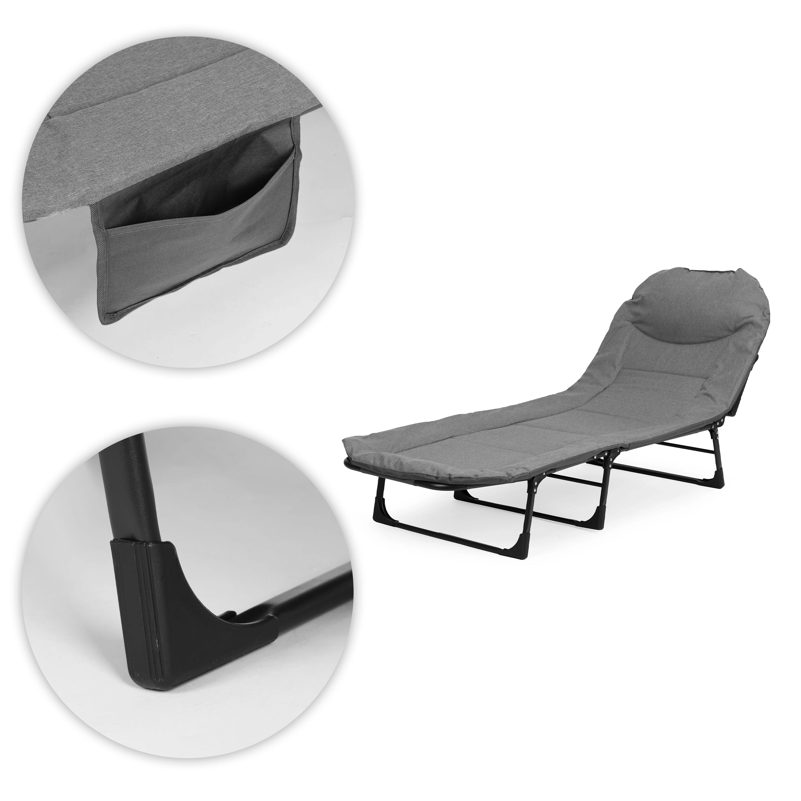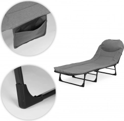 Liggestolen foldes hurtigt til kompakte mål, så du nemt kan lægge den i bilen eller i skabet. Sidelommen holder telefon, briller eller bog ved hånden, og den bløde integrerede nakkestøtte øger komforten ved længere tids hvile.