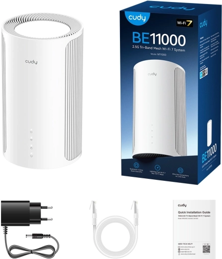 Cudy M11000 er en førsteklasses tri‑band Wi‑Fi 7 mesh‑løsning designet til krævende husholdninger og mindre kontorer. Den bruger teknologien 802.11be med hastigheder op til 5,7 Gb/s (6 GHz), 4,3 Gb/s (5 GHz) og 688 Mb/s (2,4 GHz), så den håndterer samtidig streaming, cloud‑arbejde og online gaming uden forsinkelser. Takket være støtte for MLO og MU‑MIMO øges netværkskapaciteten markant, og latenstiden falder.