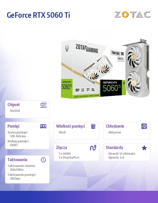 Nyd moderne spil med høj billedfrekvens takket være ZOTAC GAMING GeForce RTX 5060 Ti Twin Edge OC White. Den nye NVIDIA Blackwell-arkitektur, hurtig GDDR7 16 GB-hukommelse og DLSS 4-understøttelse leverer topydelse, bedre ray tracing og jævn afvikling selv i krævende titler.