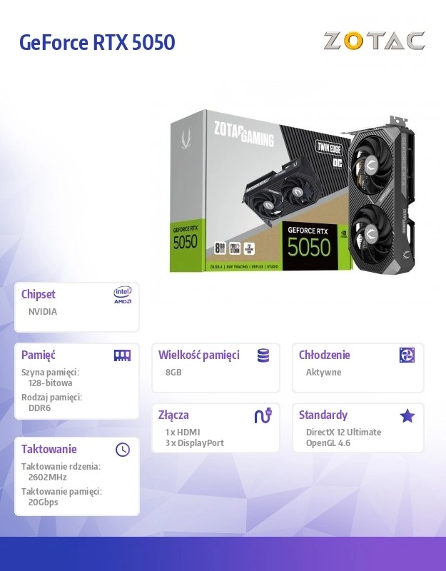 ZOTAC GAMING GeForce RTX 5050 Twin Edge OC er designet til gamere, der søger et kompakt men kraftigt grafikkort. Den moderne NVIDIA Blackwell-arkitektur og DLSS 4-teknologi giver højere billedhastigheder, skarpere billede og mere flydende spil i både Full HD og QHD.