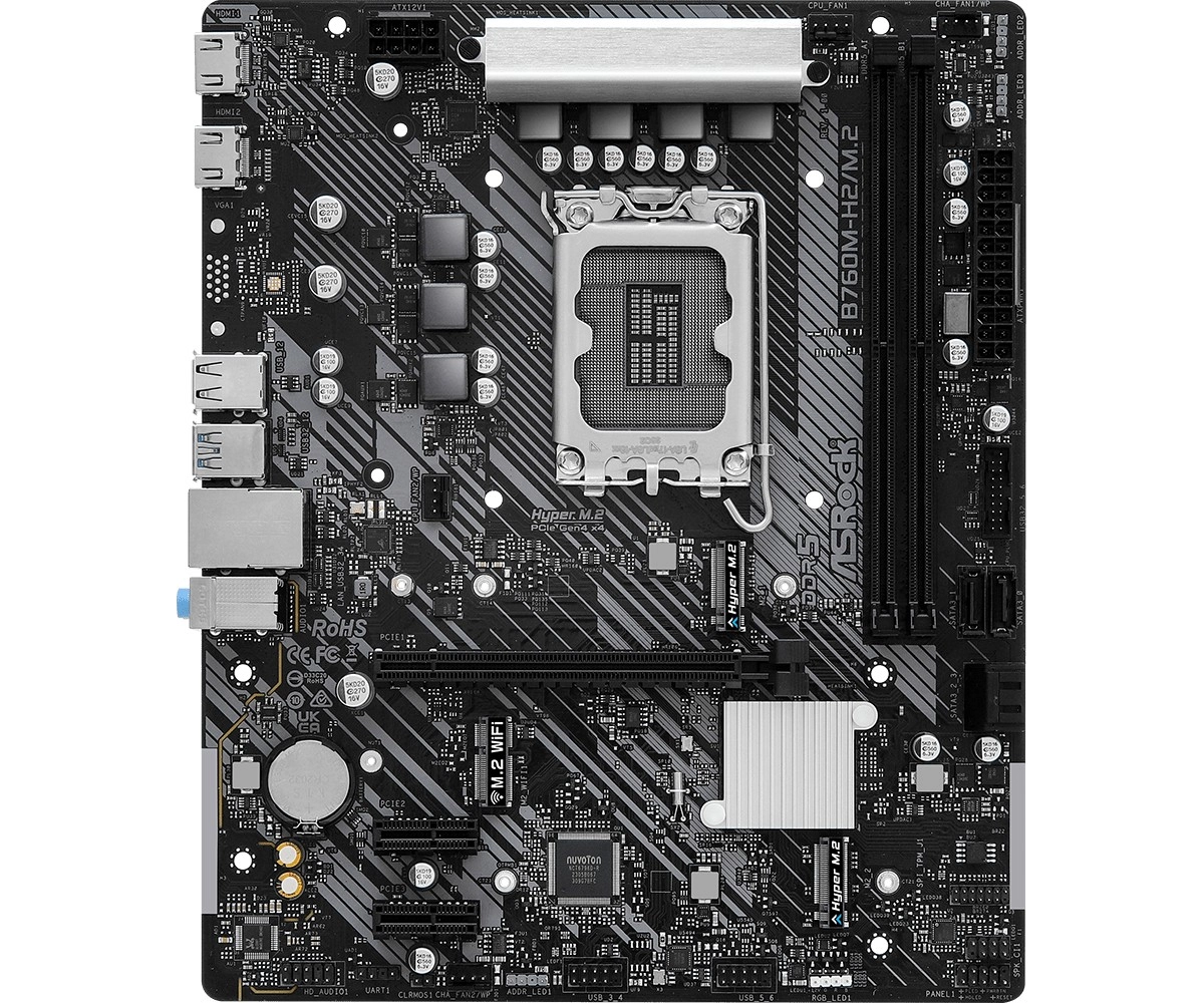 Kompakt microATX-bundkort til LGA1700 med support for Intel Core 12., 13. og 14. generation, hurtig DDR5-hukommelse op til 7200+ (OC) og omfattende tilslutningsmuligheder. Med 5+1+1 strømfasedesign, to Hyper M.2-slots (PCIe Gen4x4), 2,5G netværk og kvalitetslyd fra Realtek ALC897 er det et fremragende valg til moderne gaming- og arbejdsbuilds. Indeholder PCIe 4.0 x16, 2× HDMI, USB 3.2 Gen1 og mulighed for udvidelse med Wi‑Fi (M.2 Key E).