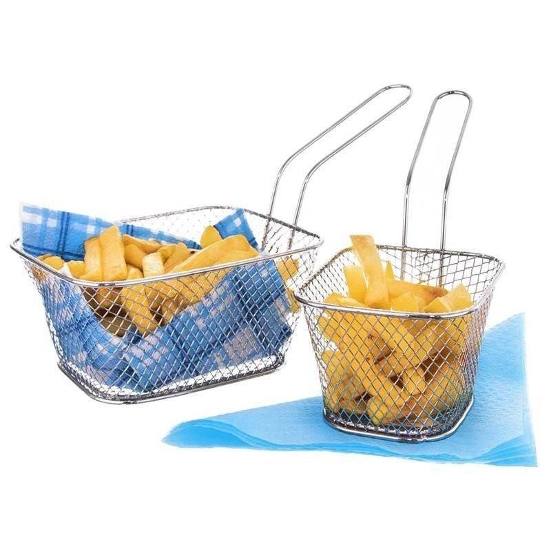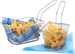 Stilfuld og praktisk kurv til servering af pommes frites, grøntsager eller nuggets i rustfrit stål i sølvfarve. Takket være det lange, komfortable håndtag er den nem at håndtere og egner sig både til servering og til stegning af mindre portioner direkte i gryden. Et fremragende valg til hjemmet og gastronomi.
