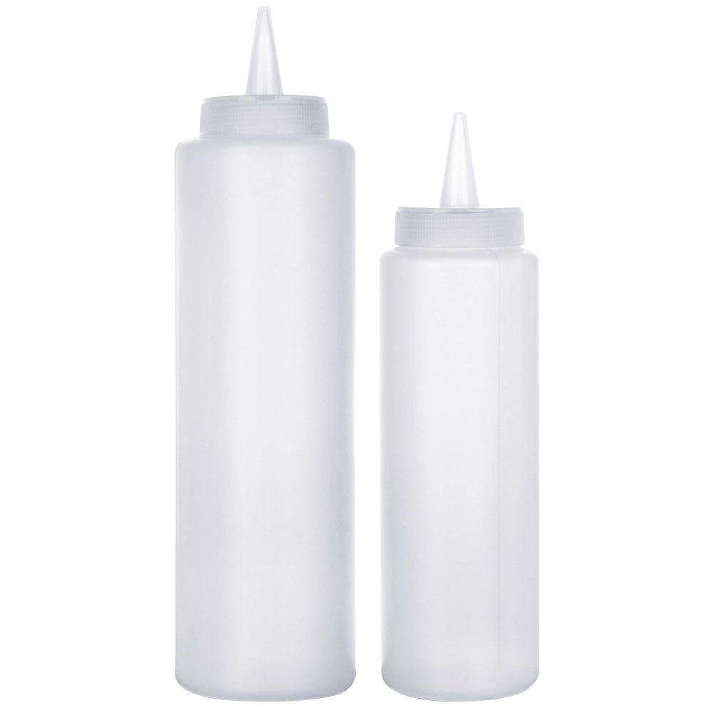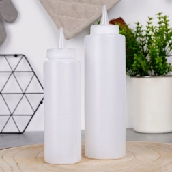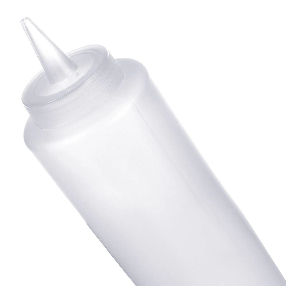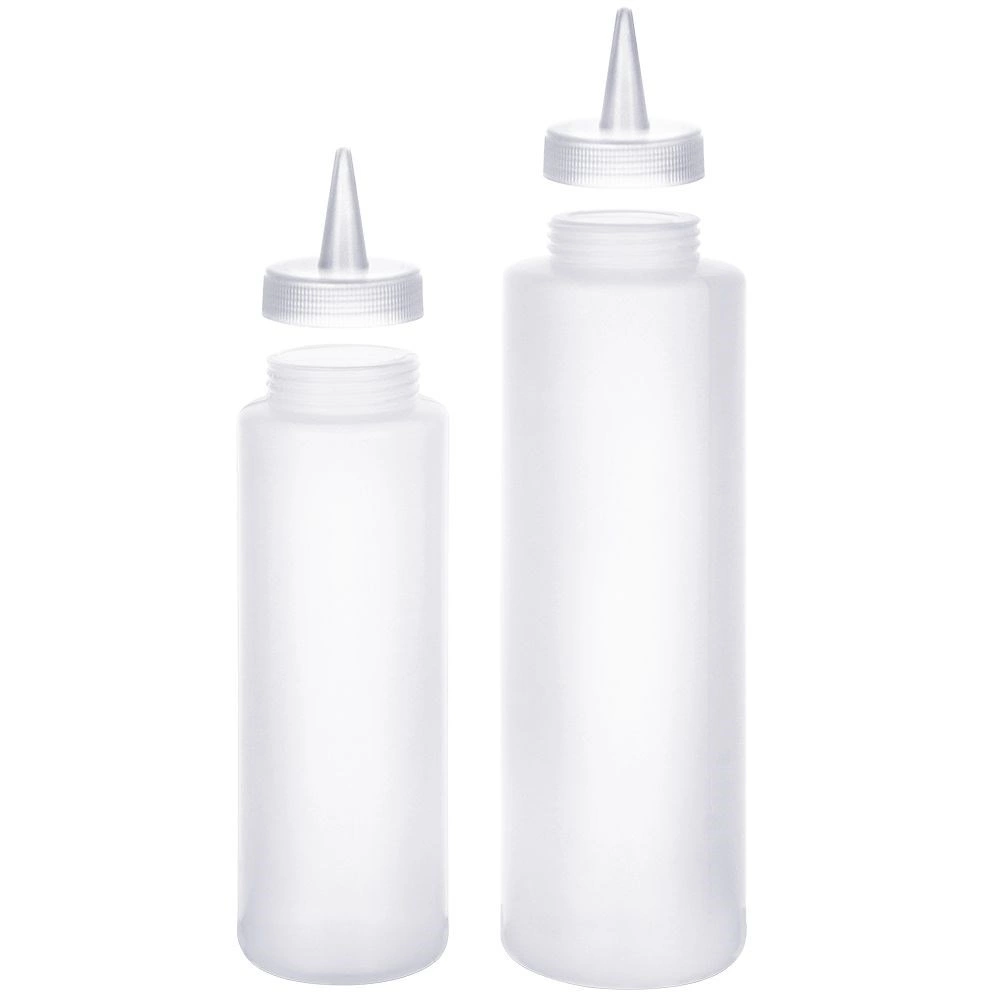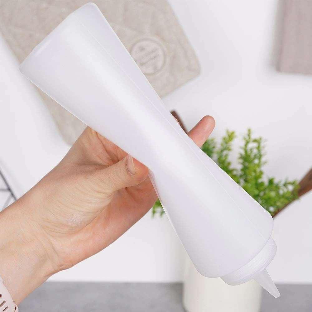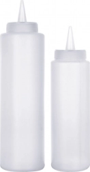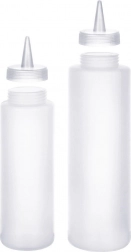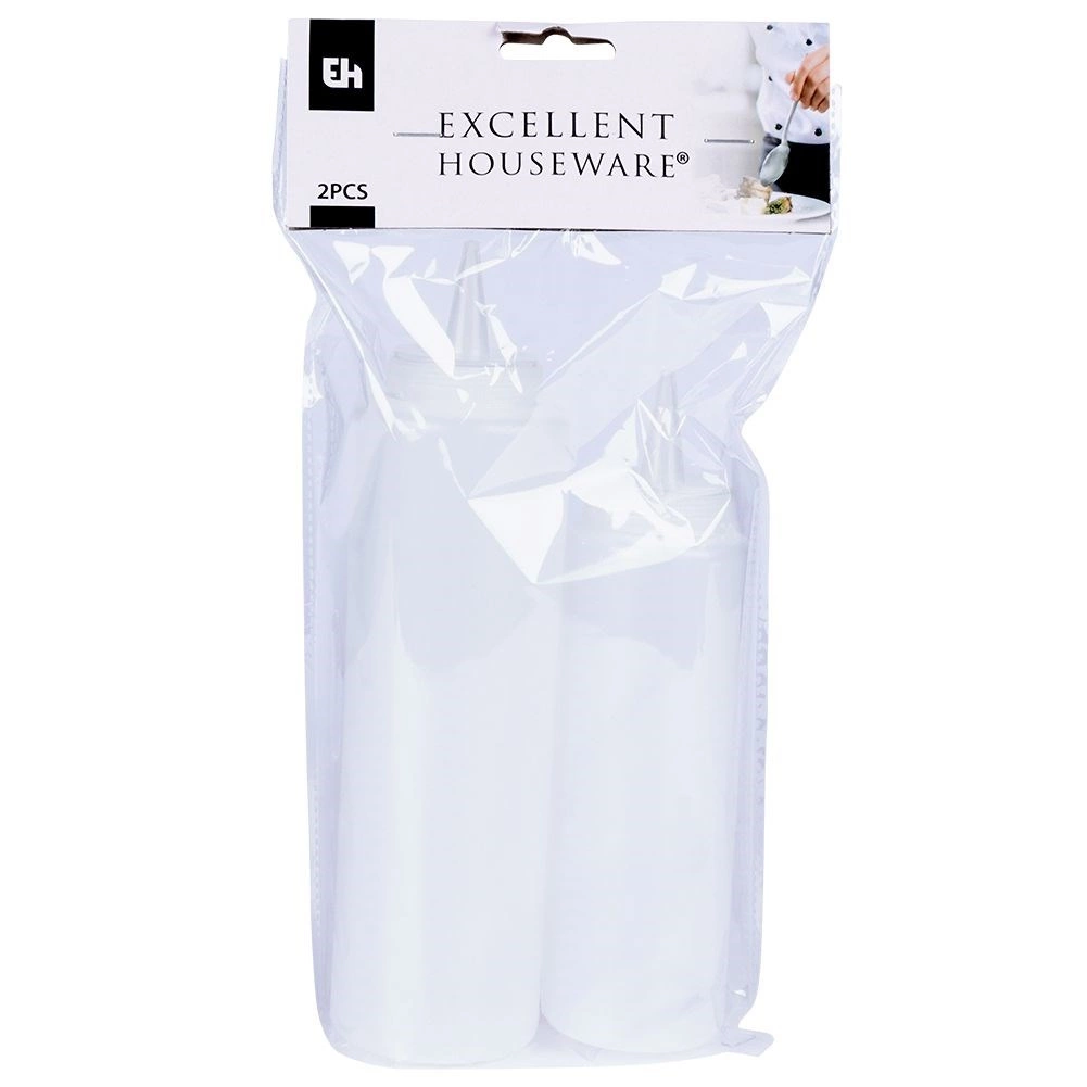 Den større flaske (500 ml, 21 × 6 cm) er ideel til saucer og olier, mens den mindre (250 ml, 18 × 5 cm) er perfekt til pyntning af kager, cupcakes og honningkager. Flaskerne er lavet af holdbar plast, er lette at fylde og rengøre og kan vaskes i opvaskemaskine.