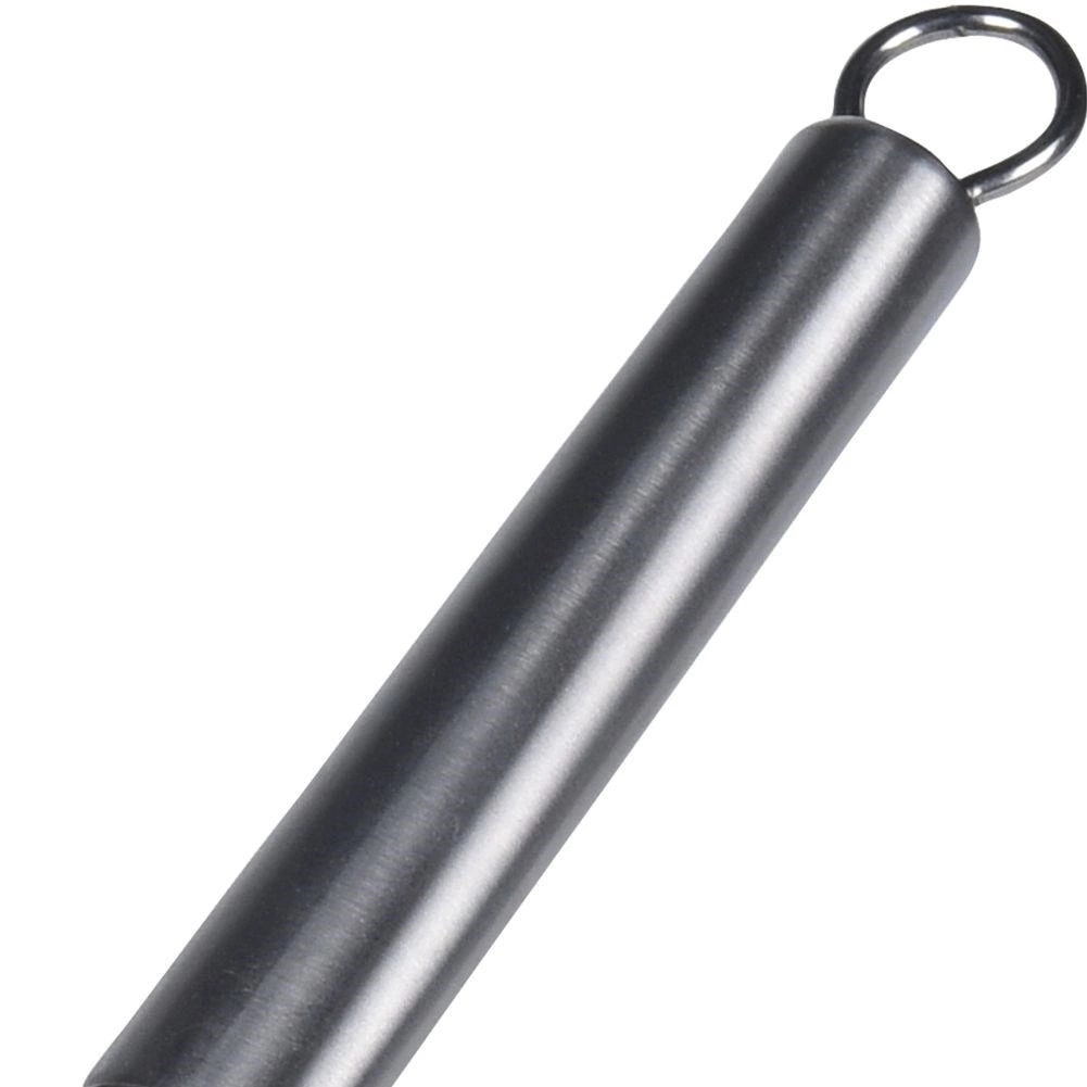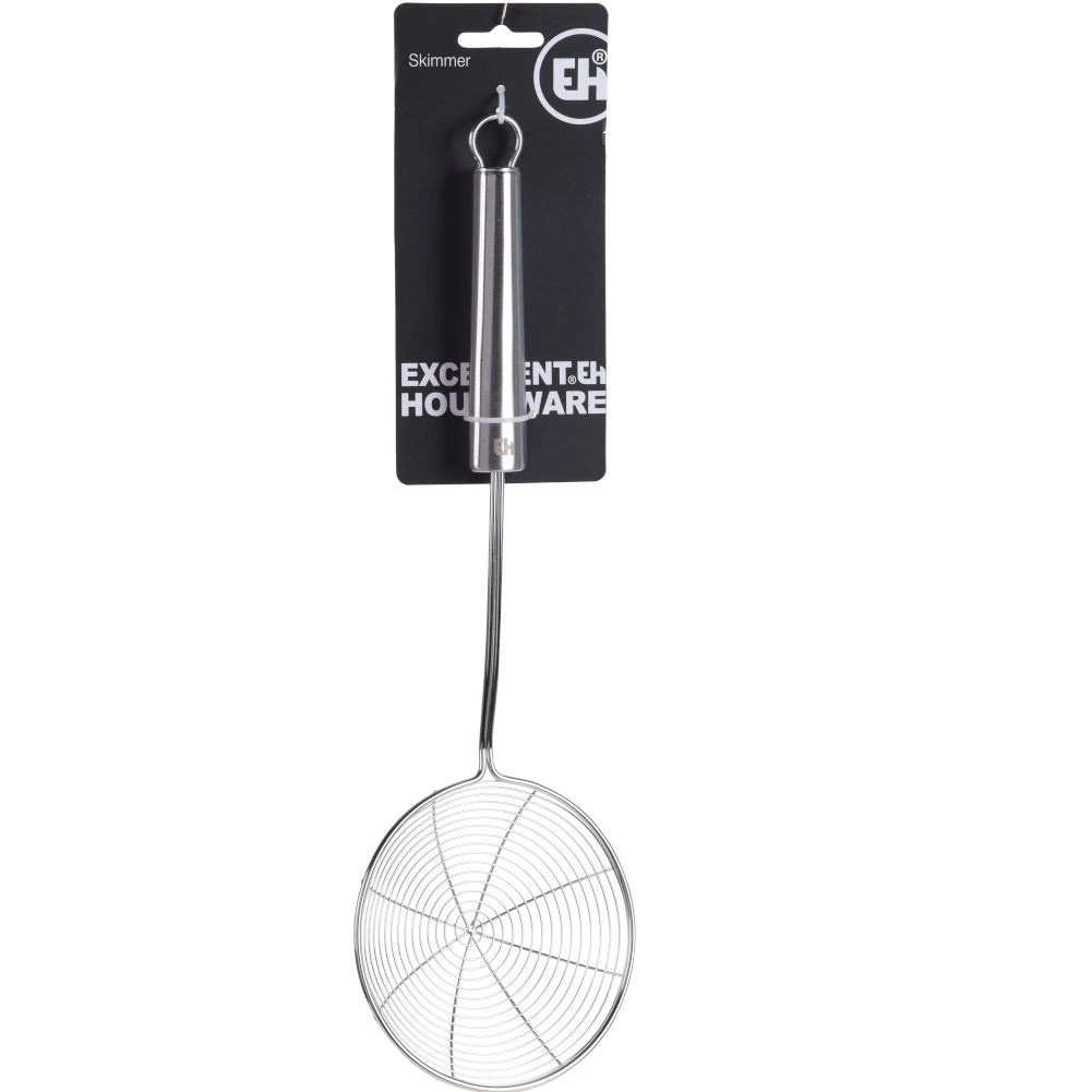 Det lange håndtag giver sikker rækkevidde over varm damp og olie, og øjet for enden muliggør ophæng på stang og pladsbesparende opbevaring. Den fulde konstruktion i rustfrit stål er korrosionsbestandig, hygiejnisk og egnet til opvaskemaskine.