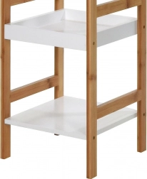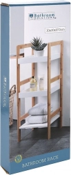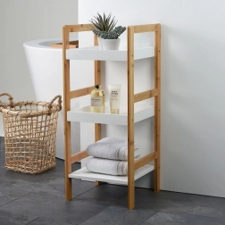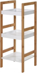 Stilfuld treetagers reol af bambustræ og MDF imponerer med sit naturlige udseende og funktionelle udførelse. Den passer til badeværelset, men er også glimrende i køkken, spisekammer, på altan eller terrasse. Takket være de kompakte mål 30 × 30 × 72 cm passer den selv i mindre rum og giver rigelig plads til hverdagens behov.