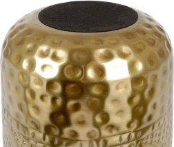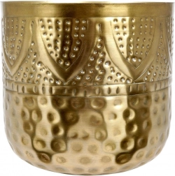 Den elegante gyldne overpotte i størrelsen 19 × 18 cm er et perfekt tilbehør til hjemmet, kontoret, altanen og terrassen. Det præcist udførte hamrede og prægede mønster skaber en sofistikeret effekt, der fremhæver skønheden i både levende og kunstige planter og beriger enhver indretning, især i glamour-stil.