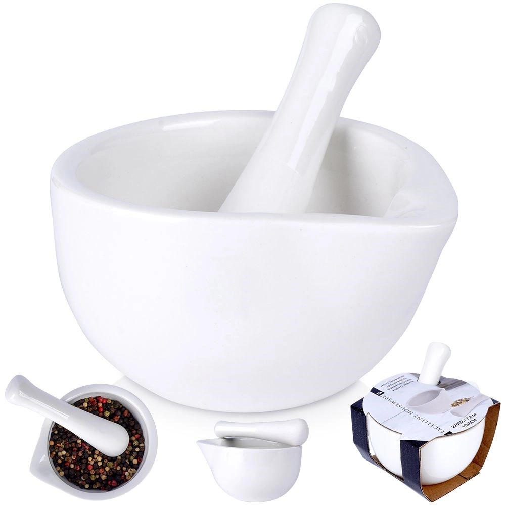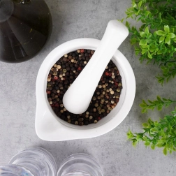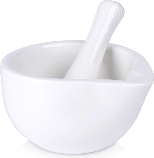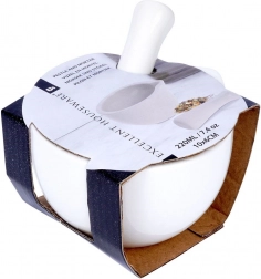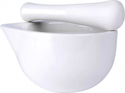 Takket være det holdbare porcelæn i elegant hvid bliver morteren en pålidelig hjælper og et stilfuldt element i køkkenet. Materialet er hygiejnisk, absorberer ikke lugt og er nemt at rengøre – også i opvaskemaskinen.