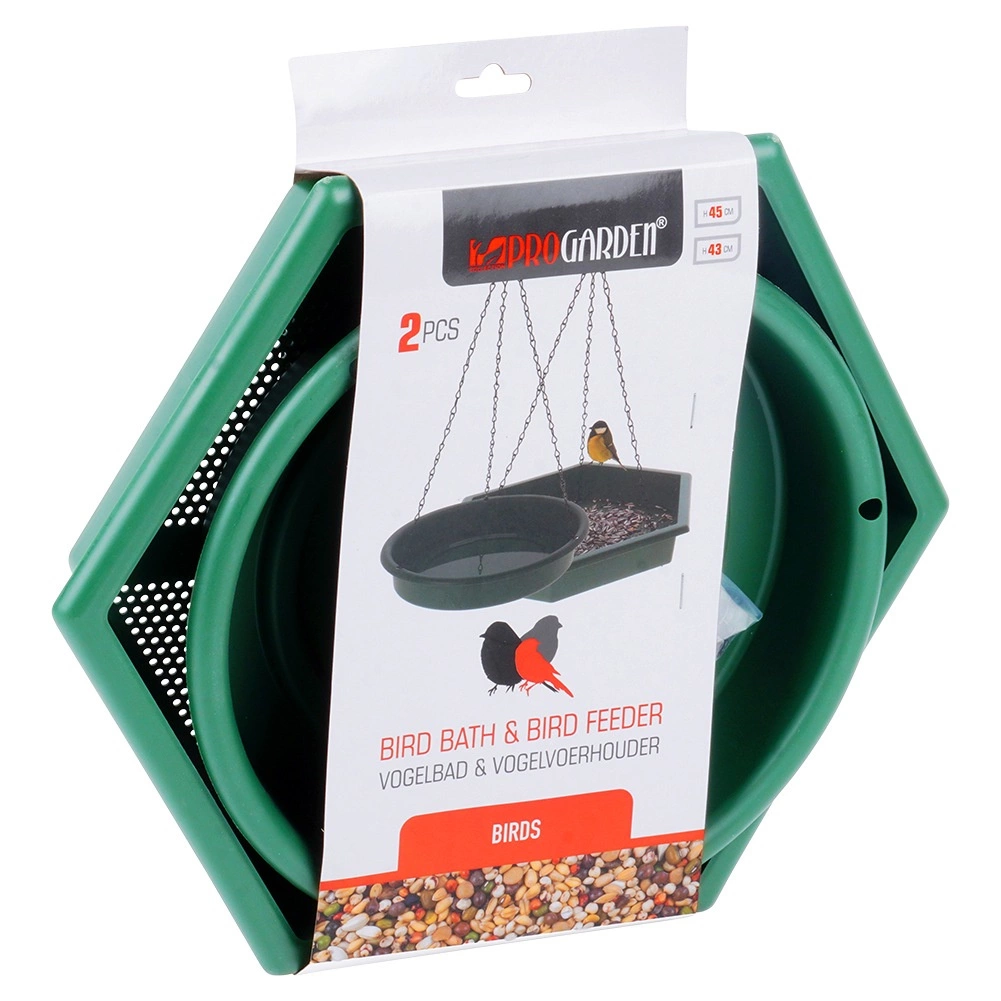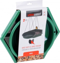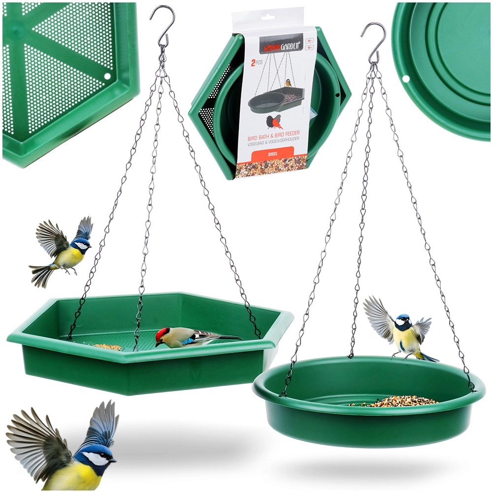 2-i-1 sættet kombinerer et rummeligt foderbræt (ca. 32 × 28 cm) med perforeret bund til vandafledning og en rund vandskål (diameter ca. 25 cm) til frisk vand. Begge bakker hænges nemt op på en gren, altan eller havekrog på få øjeblikke. Holdbar plast og solide metalkæder sikrer lang levetid og stabilitet selv i skiftende vejr.